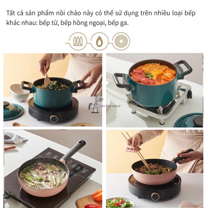 - Tất cả sản phẩm nồi chảo này có thể sử dụng trên nhiều loại bếp khác nhau: bếp từ, bếp hồng ngoại, bếp ga.