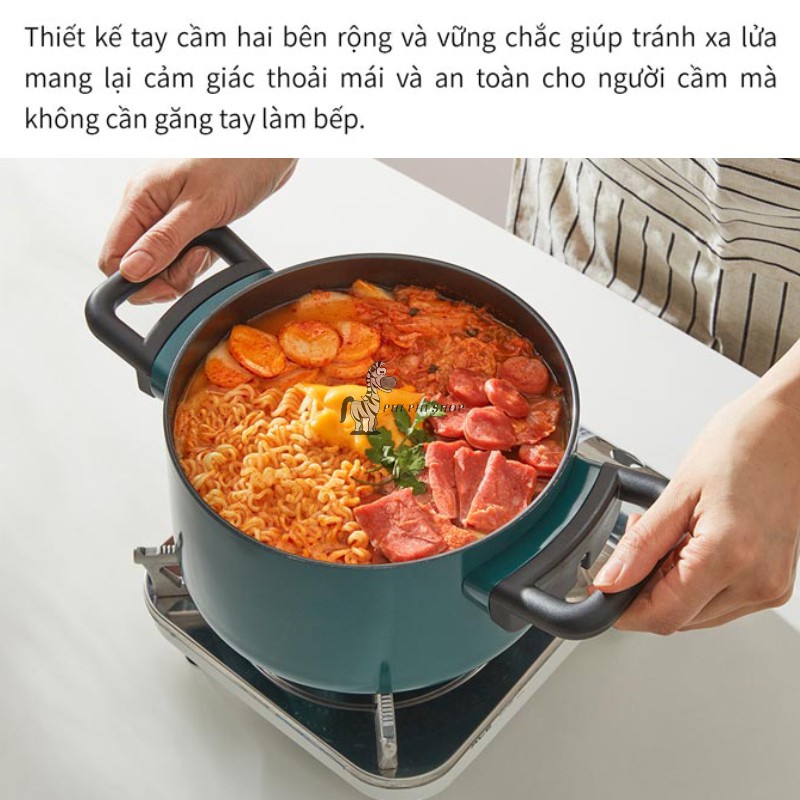 - Thiết kế tay cầm hai bên rộng và vững chắc giúp tránh xa lửa mang lại cảm giác thoải mái và an toàn cho người cầm mà không cần găng tay làm bếp.