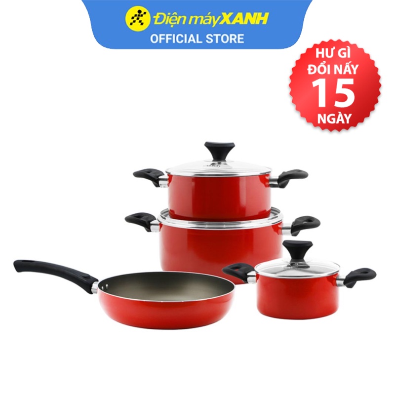 • Bộ 4 nồi chảo thiết kế màu đỏ nổi bật, kiểu dáng hiện đại phù hợp với mọi không gian bếpThiết kế tay cầm bọc nhựa chống nóng, cùng nắp kính chịu nhiệt quan sát thức ăn dễ dàng và dễ chùi rửa.