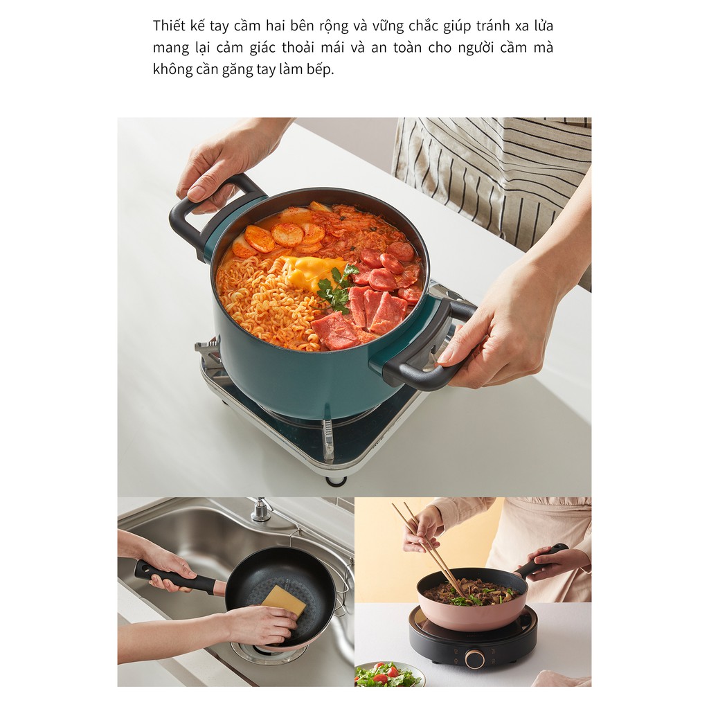 Thiết kế tay cầm hai bên rộng và vững chắc giúp tránh xa lửa mang lại cảm giác thoải mái và an toàn cho người cầm mà không cần găng tay làm bếp.