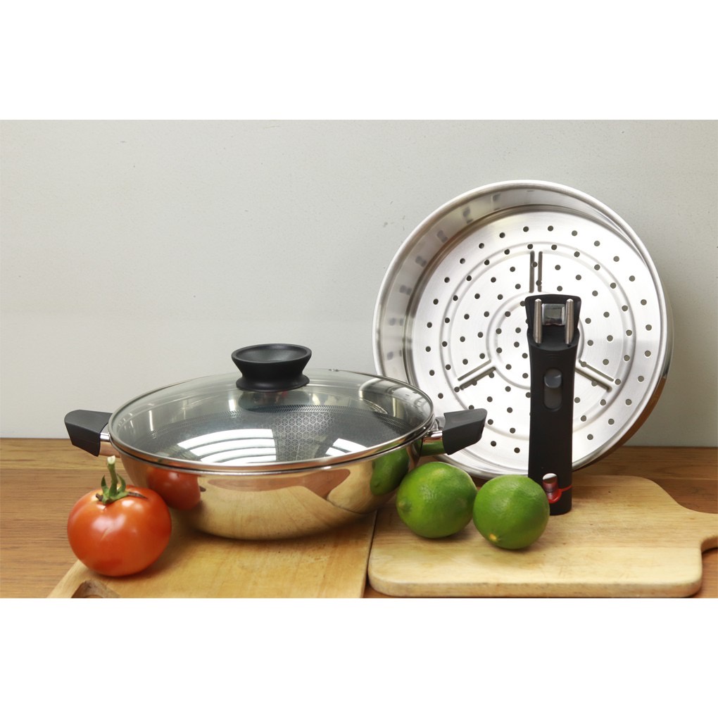 Kết cấu 3 lớp đúc liền dẫn nhiệt đều và nhanh mang đến những món ăn trọn vẹn hương vị tươi ngon và tốt cho sức khỏe cả gia đình. Tay cầm tháo rời giúp dễ dàng chùi rửa, giảm thiểu vướng víu khi nấu ăn và tiết kiệm không gian cất trữ.