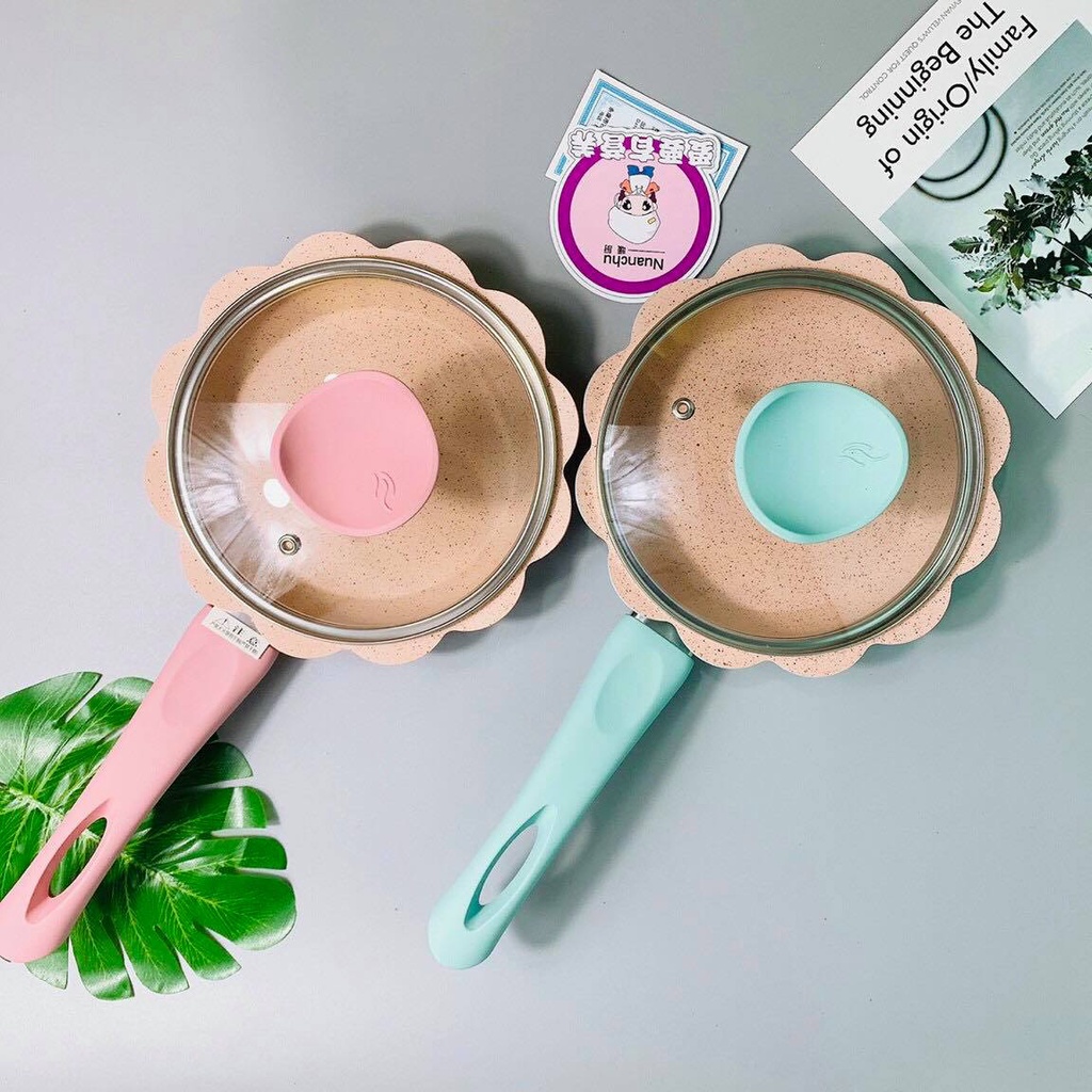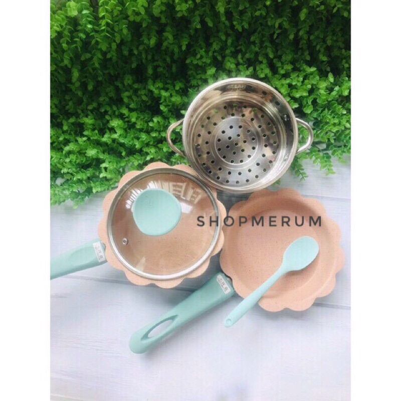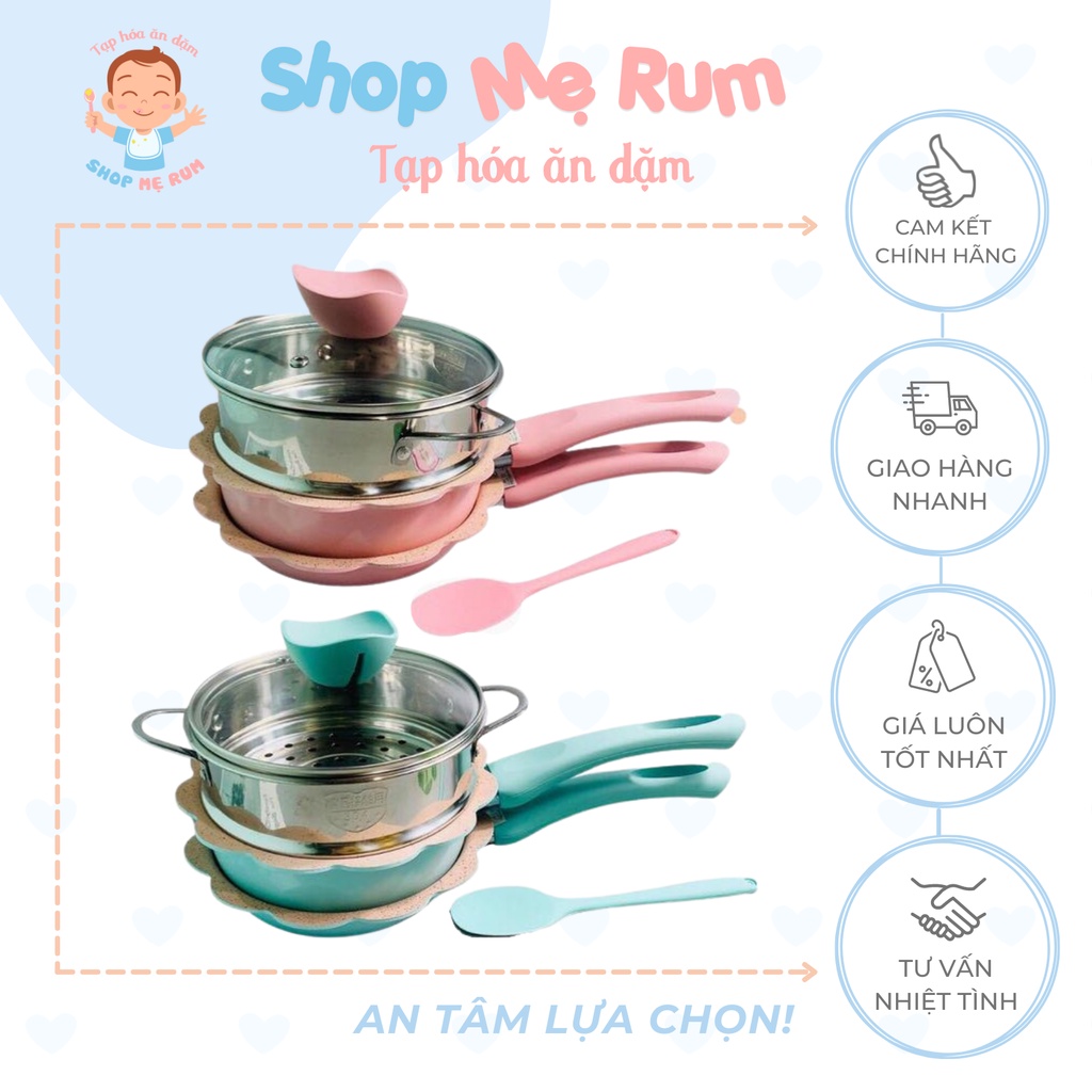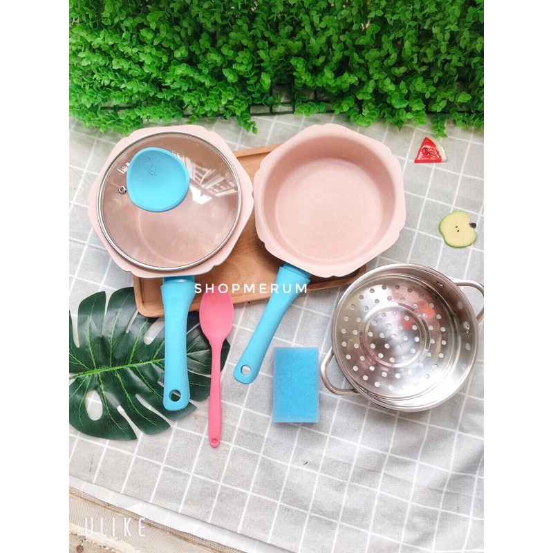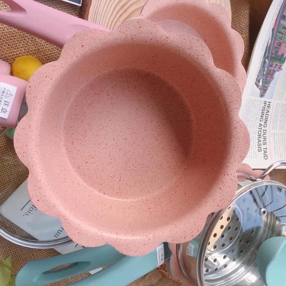 Bộ Nồi, Chảo, Xửng hấp Men Đá Hình Hoa Tặng Kèm Phới Silicon Chế Biến Đồ Ăn Dặm Cho Bé