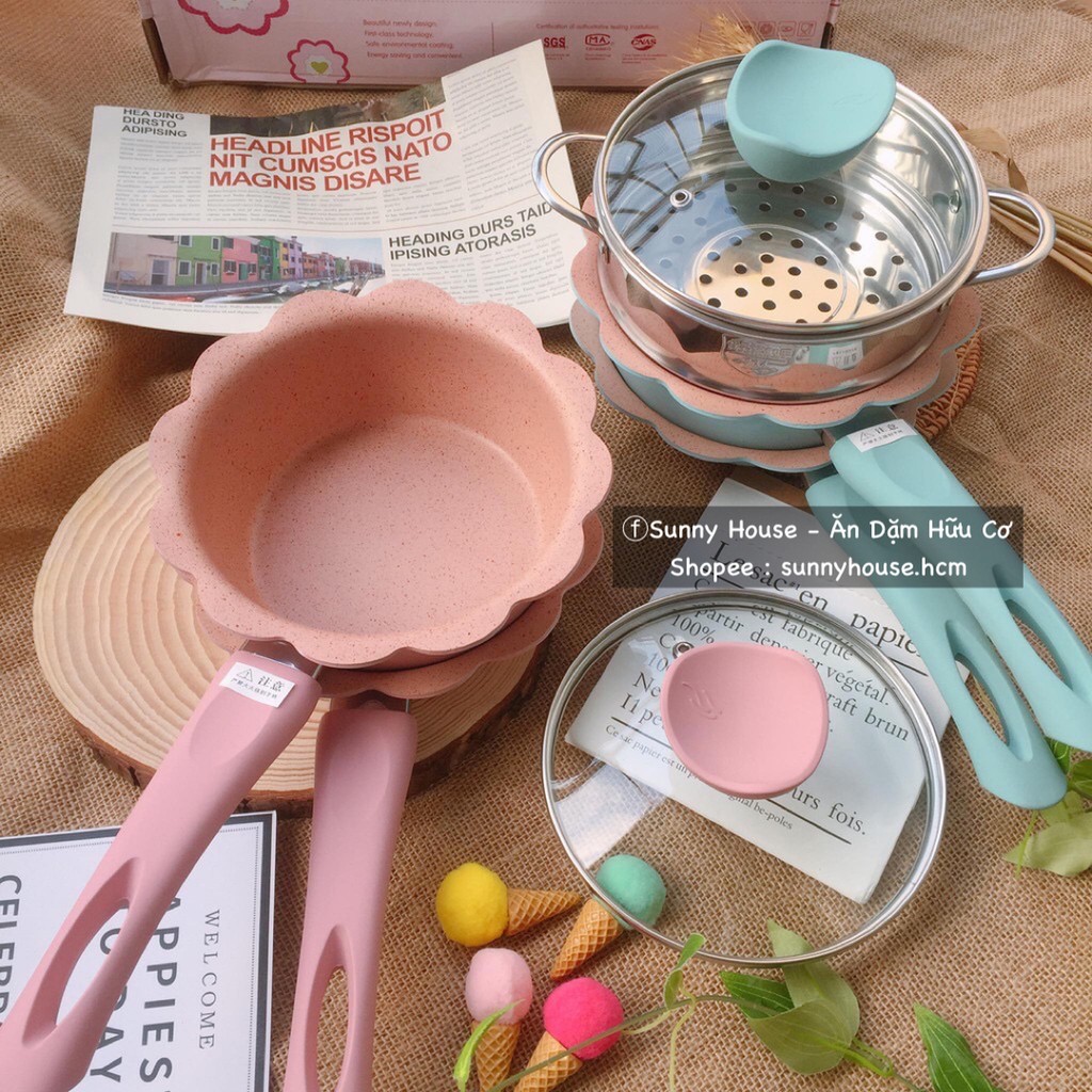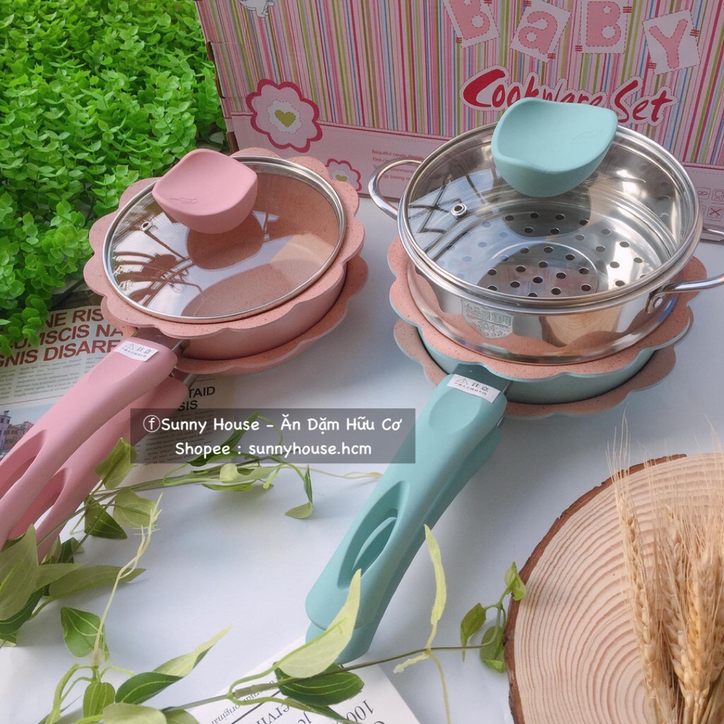 Bộ nồi, chảo, xửng hấp men đá hình hoa cao cấp Sakura chế biến ăn dặm cho bé