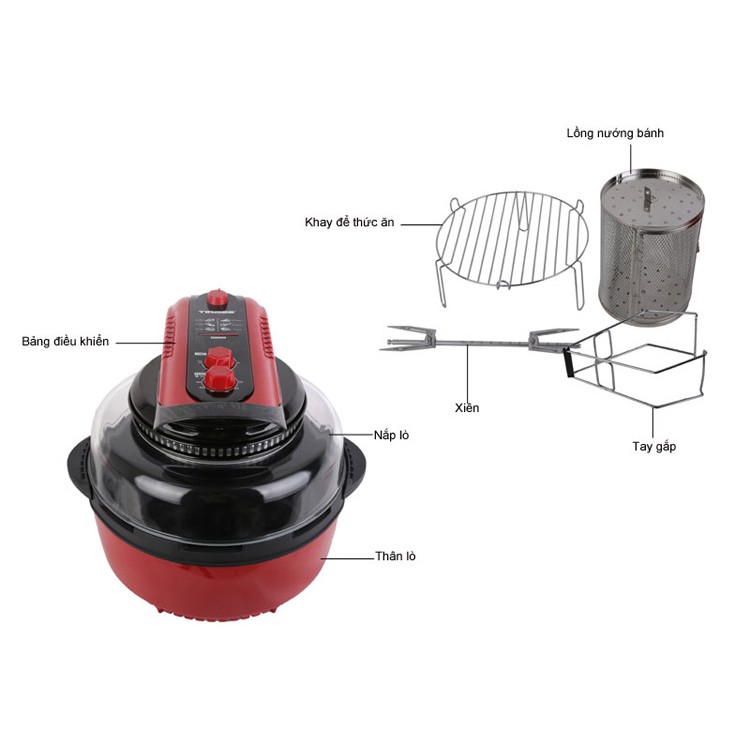 Nồi Chiên Không Khí Đa Năng Tiross TS903 - 11L (Đỏ Đen)sở hữu thiết kế tiện lợi với nhiều phụ kiện đa năng đính kèm như lồng chiên, trục xiên 360 độ, giá đỡ thực phẩm, giúp bạn nấu chín thực phẩm theo nhiều cách khác nhau mà vẫn đảm bảo thức ăn thơm ngon.