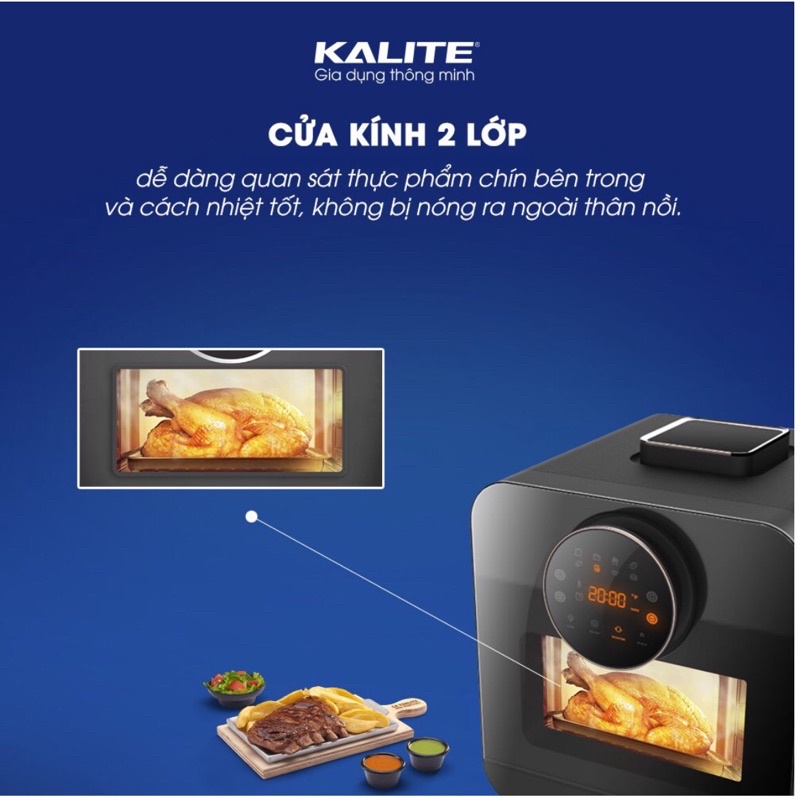- Cánh cửa Kalite Steam Star được thiết kế với mặt kính 2 lớp trong suốt, cách nhiệt và chịu nhiệt cao. Có thể dễ dàng quan sát quá trình làm chín thức ăn một cách trực quan, giúp kiểm soát thực phẩm chín đều và ngon hơn.