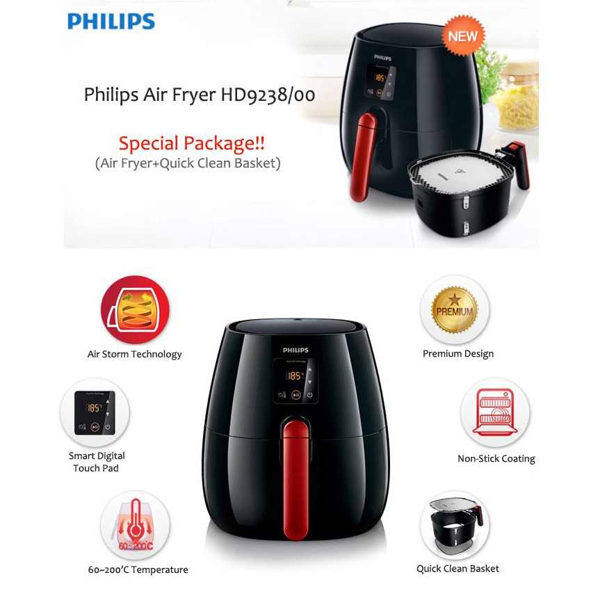 Nồi chiên Philips HD9238 với công nghệ Rapid air: Công nghệ Rapid air cho phép bạn thưởng thức nhưng món chiên, nướng, quay một cách nhanh chóng và giờ đây không còn lo lắng khi phải tiêu thụ một lượng mỡ lớn như khi chiên một cách thông thường, nồi chiên Philips HD9238 cũng không tạo nhiều mùi khiến căn bếp căn nhà ngập trong mùi khó chịu. dễ dàng lau chùi và làm sạch không tốn nhiều thời gian, công sức.