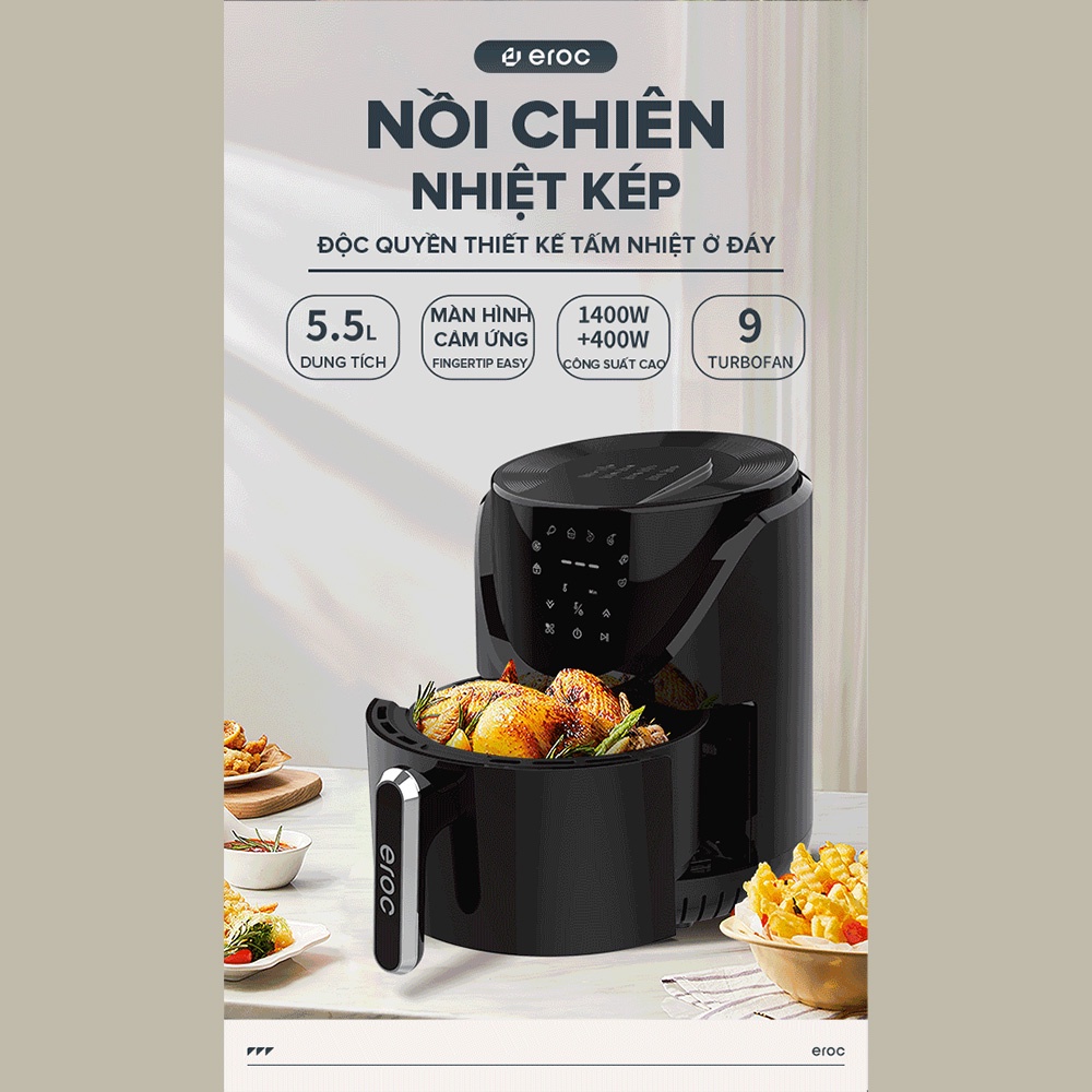 Thiết Bị Điện Gia Dụng > Đồ gia dụng nhà bếp > Nồi chiên không dầu || Nồi Chiên Không Dầu [1 Đổi 1] Eroc V-D2 Chống Dính 5.5L [Thép Không Gỉ, Công Suất: 1400W + 400W, Màn Hình Cảm Ứng ChạmCòn hàng