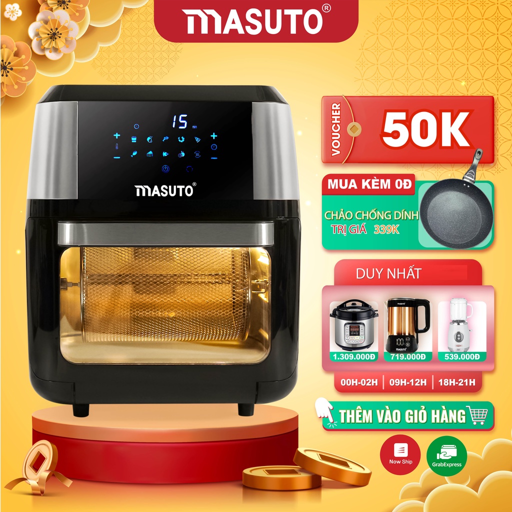 Nồi chiên không dầu kiêm lò nướng chính hãng Masuto 12L quay gà nguyên con chiên khoai siêu giòn TẶNG CHẢO TỪ VÂN ĐÁ