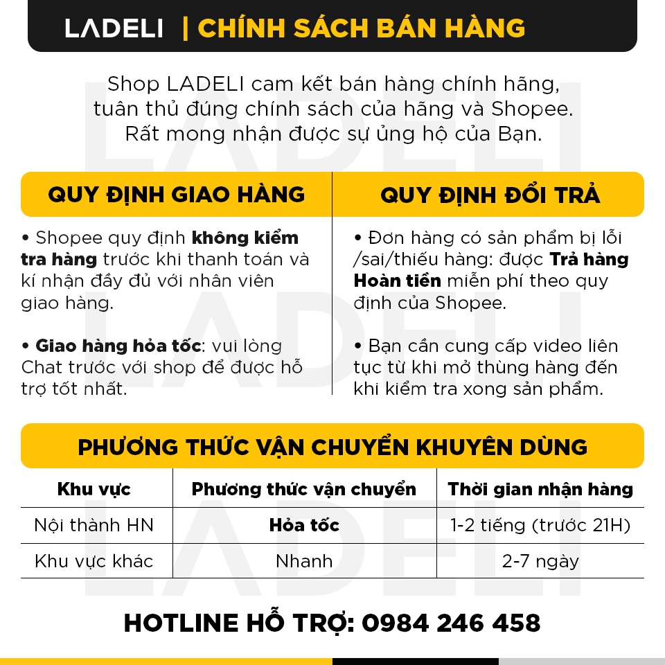 🟨⬛ GIAO HÀNG HỎA TỐC: Khách hàng tại nội thành Hà Nội vui lòng chọn giao hàng Hỏa tốc hoặc CHAT với shop để được hỗ trợ nhé. Shop LADELI xin cảm ơn.