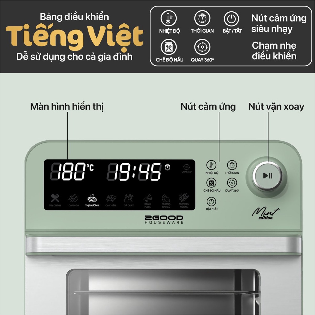 Nồi chiên không dầu 2GOOD là sự tổng hợp của nhiều thiết bị và dụng cụ nấu nướng, với bộ hẹn giờ kỹ thuật số được tích hợp chế độ tự động tắt LÒ NƯỚNG + NỒI CHIÊN + VỈ NƯỚNG + CHẢO CHIÊN + LÒ SẤY. Sản phẩm có dung tích lớn, bạn có thể dễ dàng chế biến các món ngon. Có thể trực tiếp quan sát quy trình chế biến món ăn. Bảng hiển thị màn hình cảm ứng lớn, thao tác đơn giản và thuận tiện.• THÔNG SỐ KỸ THUẬT NỒI CHIÊN KHÔNG DẦU 2GOOD