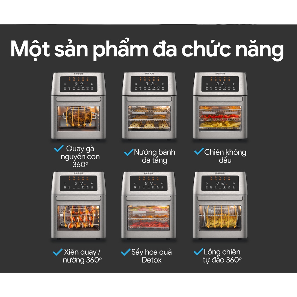 ✔ Bổ sung thêm các chế độ đặc biệt như: Sấy Hoa Quả, Quai gà nguyên con 360 độ, Lồng đảo khoai, Xiên Quay,…