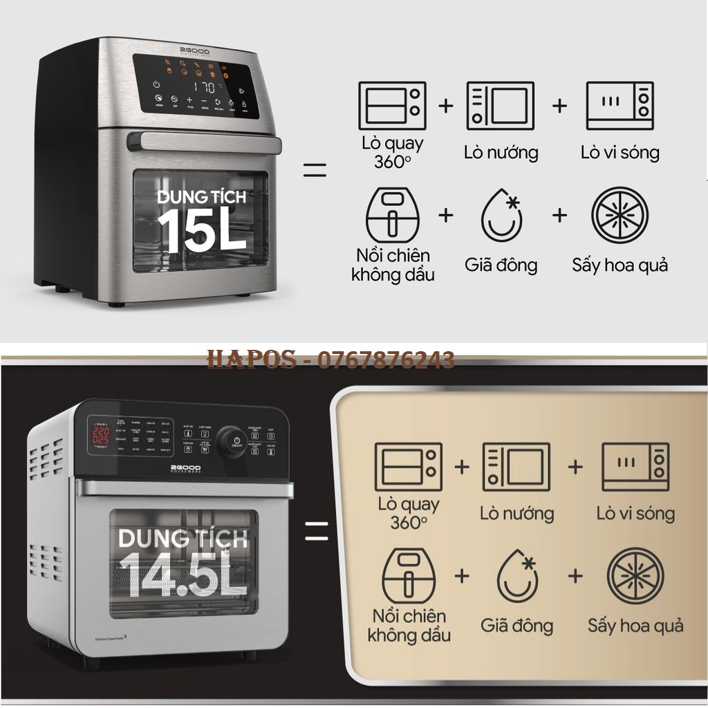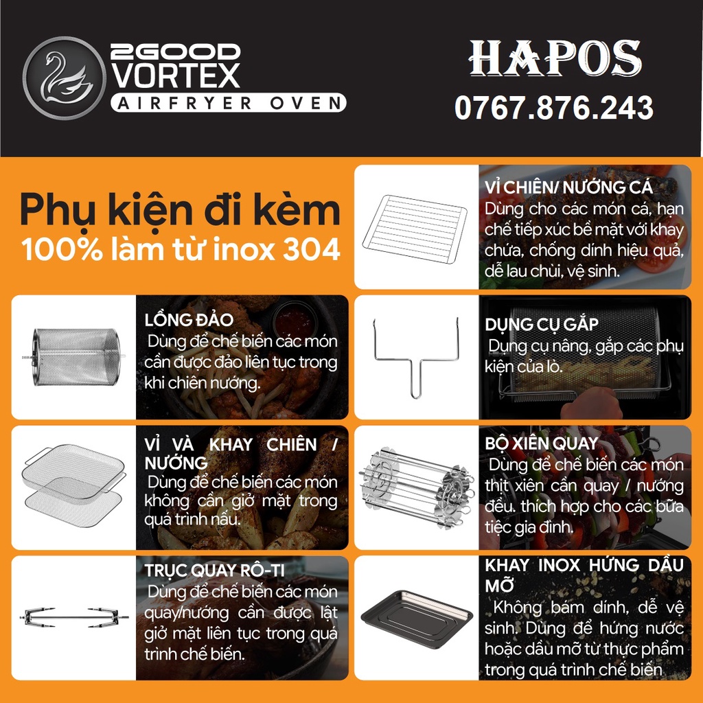 Giới thiệu Nồi chiên không dầu 2GOOD Vortex S18, S19, S20 inox 304, lò nướng điện làm bánh mì, thịt, cá đa năng chính hãng - HAPOS