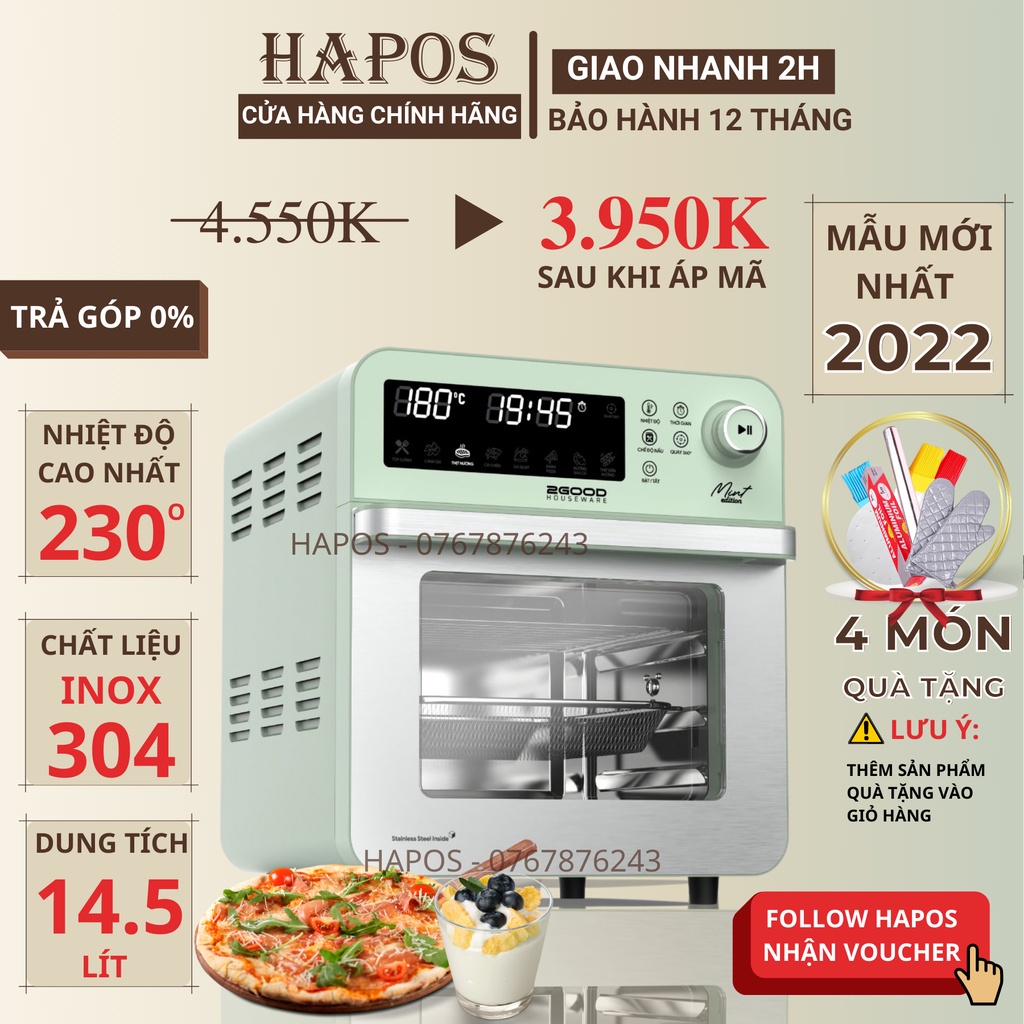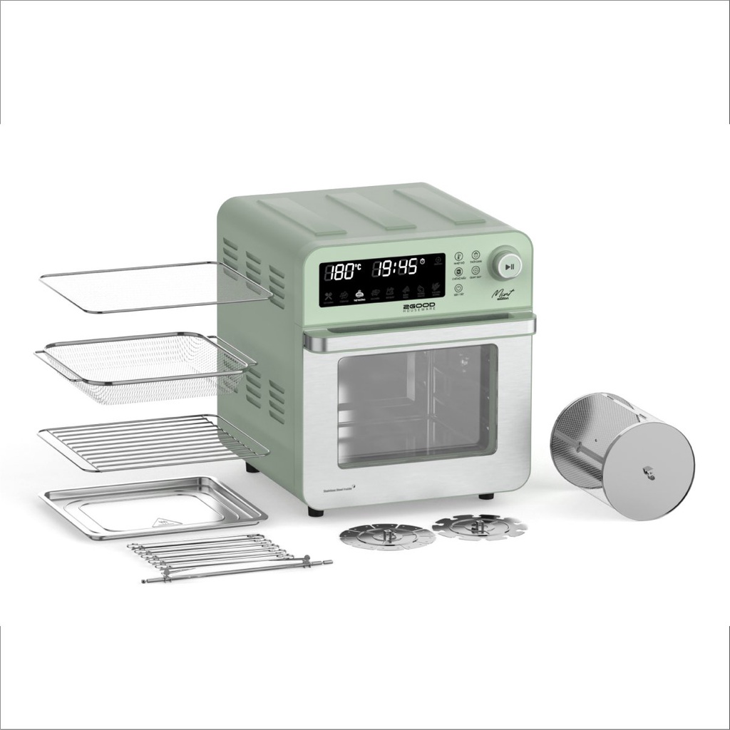 Nồi chiên không dầu 2GOOD là sự tổng hợp của nhiều thiết bị và dụng cụ nấu nướng, với bộ hẹn giờ kỹ thuật số được tích hợp chế độ tự động tắt LÒ NƯỚNG + NỒI CHIÊN + VỈ NƯỚNG + CHẢO CHIÊN + LÒ SẤY. Sản phẩm có dung tích lớn, bạn có thể dễ dàng chế biến các món ngon. Có thể trực tiếp quan sát quy trình chế biến món ăn. Bảng hiển thị màn hình cảm ứng lớn, thao tác đơn giản và thuận tiện.• THÔNG SỐ KỸ THUẬT NỒI CHIÊN KHÔNG DẦU 2GOOD