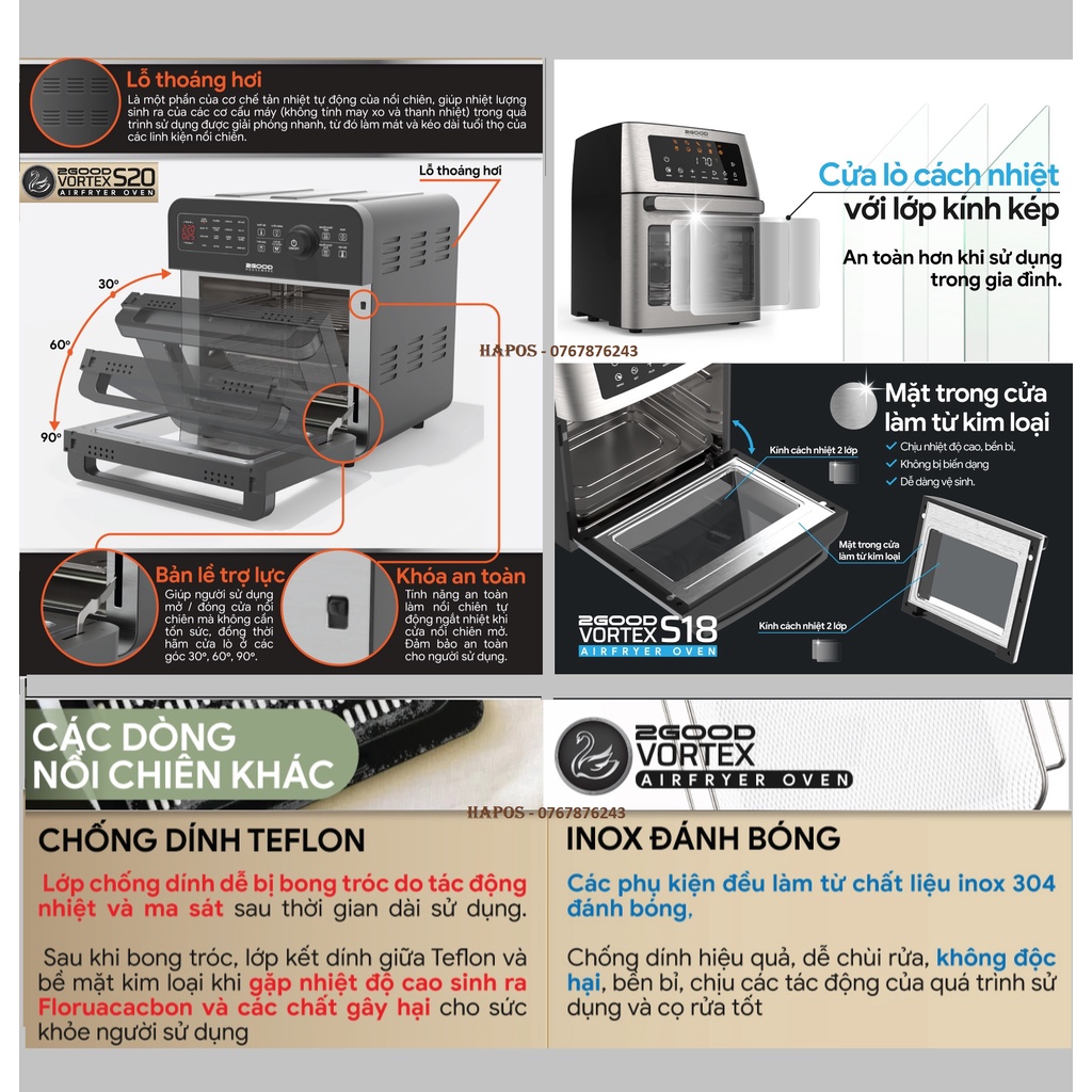 Nồi chiên không dầu 2GOOD Vortex S18, S19, S20 inox 304, Lò nướng điện làm bánh mì, thịt, cá đa năng chính hãng - HAPOS