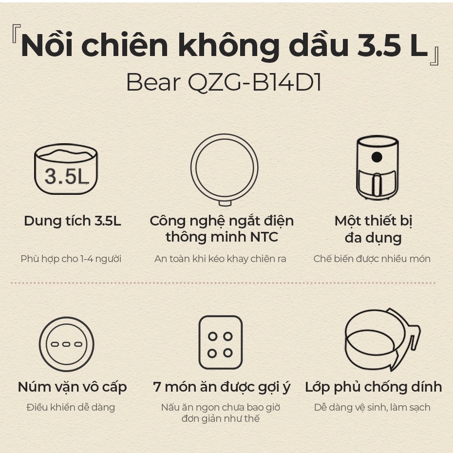 [Mã ELHADEV giảm 4% đơn 300K] Nồi chiên không dầu 3.5L 1400W Bear QZG-B14D1 - Chính hãng - BH 18 tháng