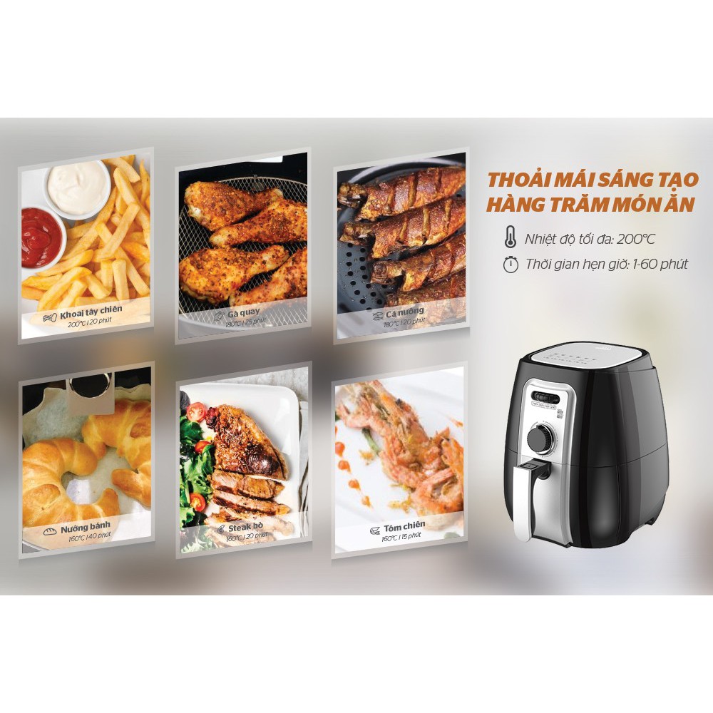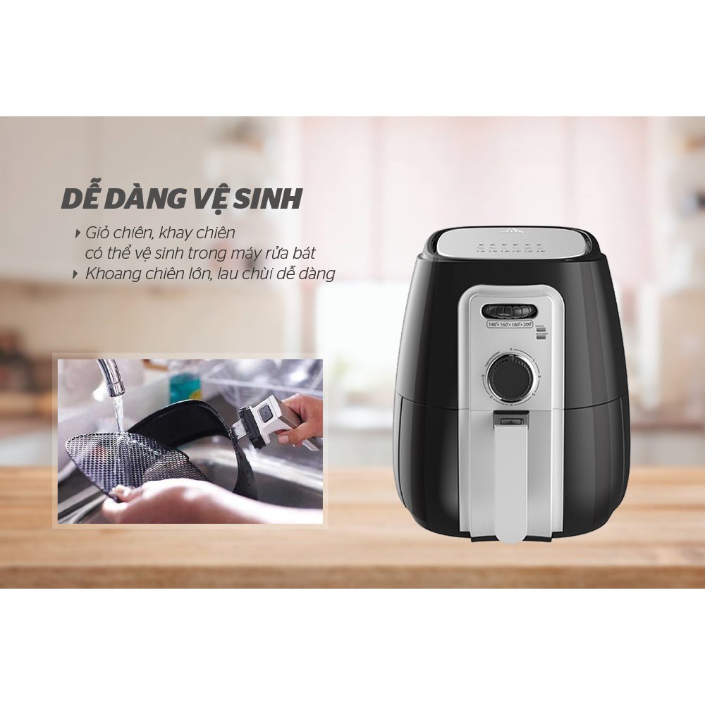 Ngay cả những người ít sử dụng đồ điện tử cũng có thể dễ dàng sử dụng nồi chiên không dầu bởi bảng điều khiển cơ với các núm xoay đơn giản. Trên các núm xoay đã được ghi chú thời gian, nhiệt độ rõ ràng để bạn lựa chọn chế độ chiên phù hợp với thực phẩm.