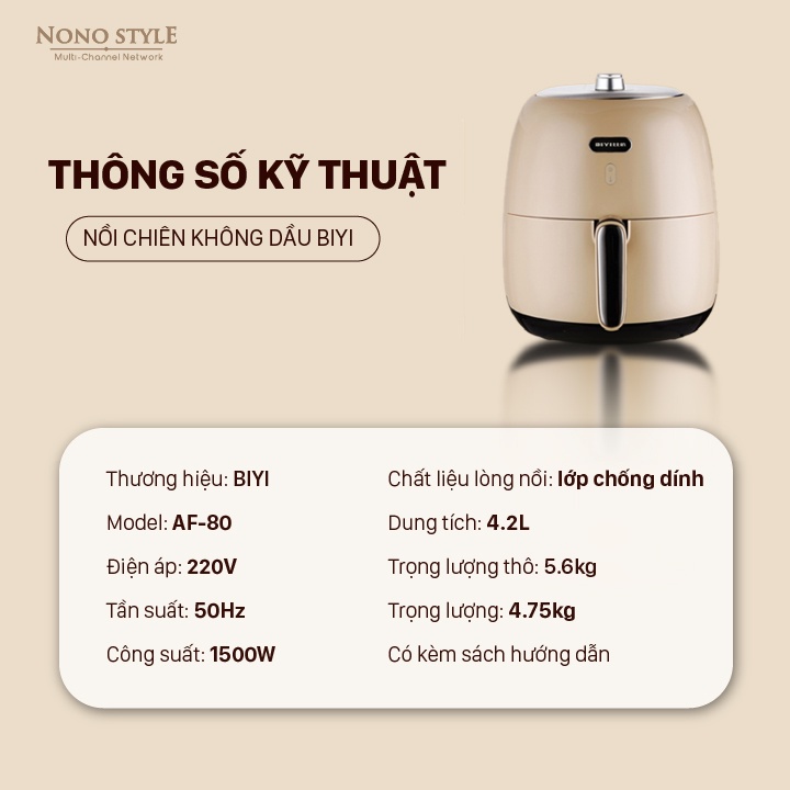 Nồi chiên không dầu 4.2 lít BIYI AF80 - Núm vặn cơ, dễ dàng sử dụng, công suất 1500W - BH 12 THÁNG✅ Thông Số Sản Phẩm