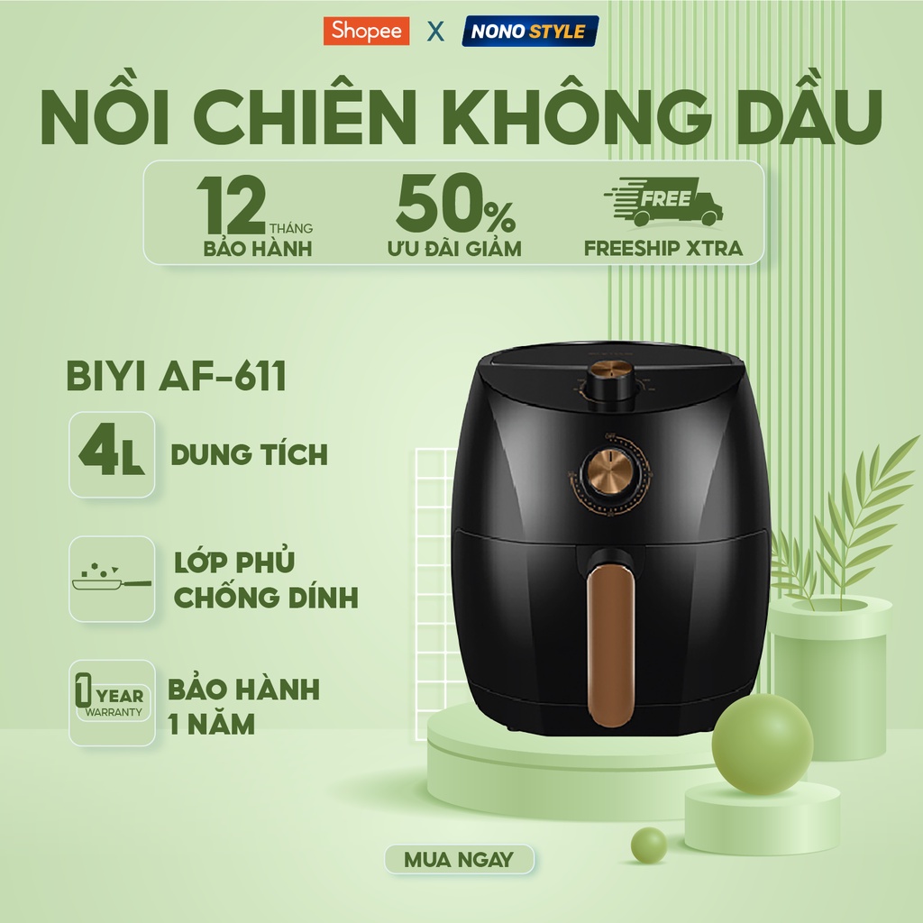 Nồi Chiên Không Dầu 4 Lít BIYI AF611 - Bảo Hành 12 Tháng - Bếp Chiên Chống Dính - An Toàn, Tiện LợiHạn chế 95% lượng dầu vào cơ thể, đây là một giải pháp thông minh cho Tim mạch/ Cân nặng/ Huyết áp/... cho cả nhà.