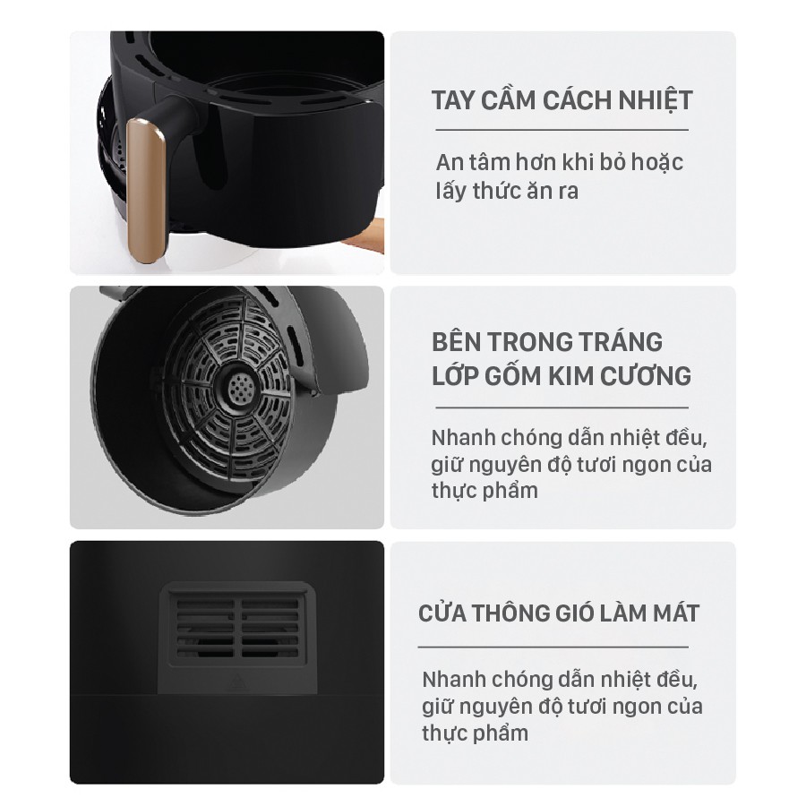 - Sử dụng công nghệ tuần hoàn sức gió nóng 360 độ và lớp tráng men kim cương dẫn nhiệt nhanh, với mức nhiệt độ 200 độ C nhanh chóng lấy ra dầu mỡ dư thừa từ trong thức ăn, làm thức ăn nóng giòn.