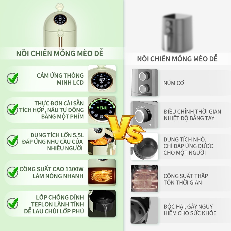 - Nồi chiên dung tích lớn 5.5L ,gà nguyên con (cho 5 người),khoai tây chiên (cho 5 người). Công suất 1300W, nóng nhanh, tiết kiệm thời gian.