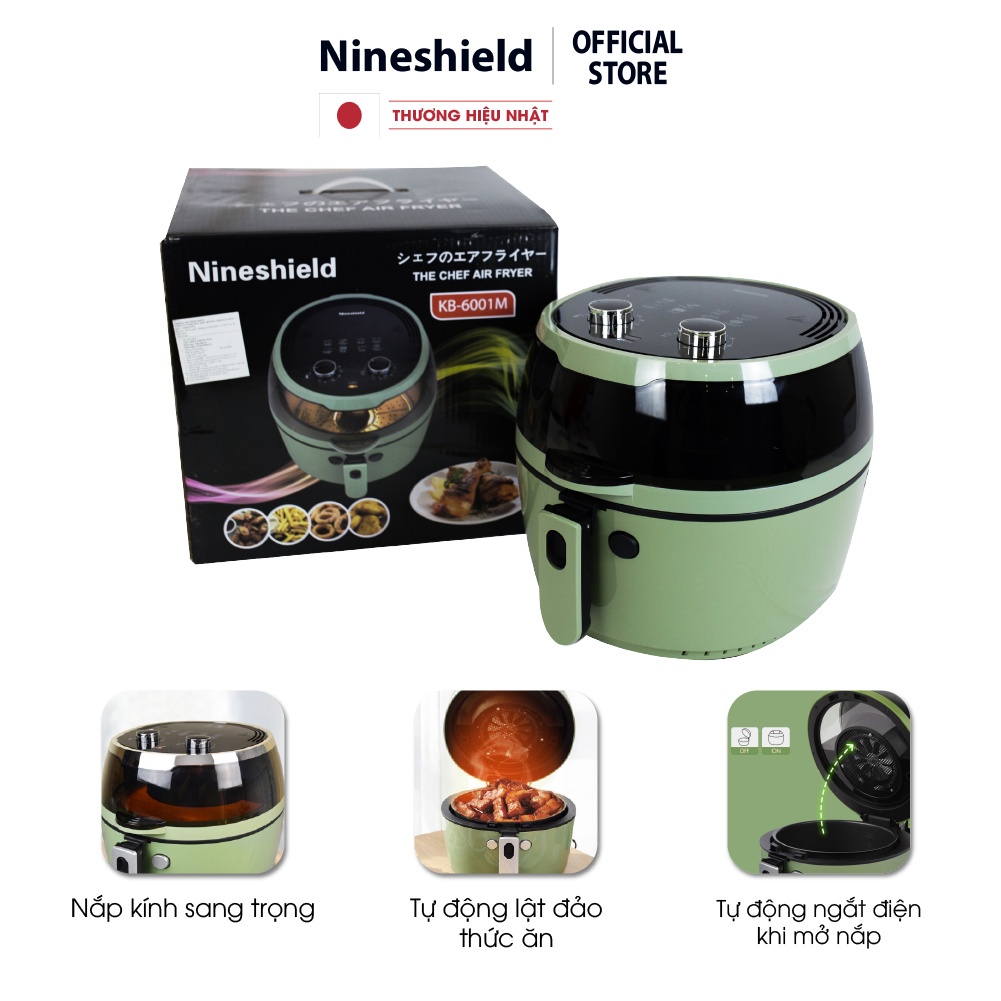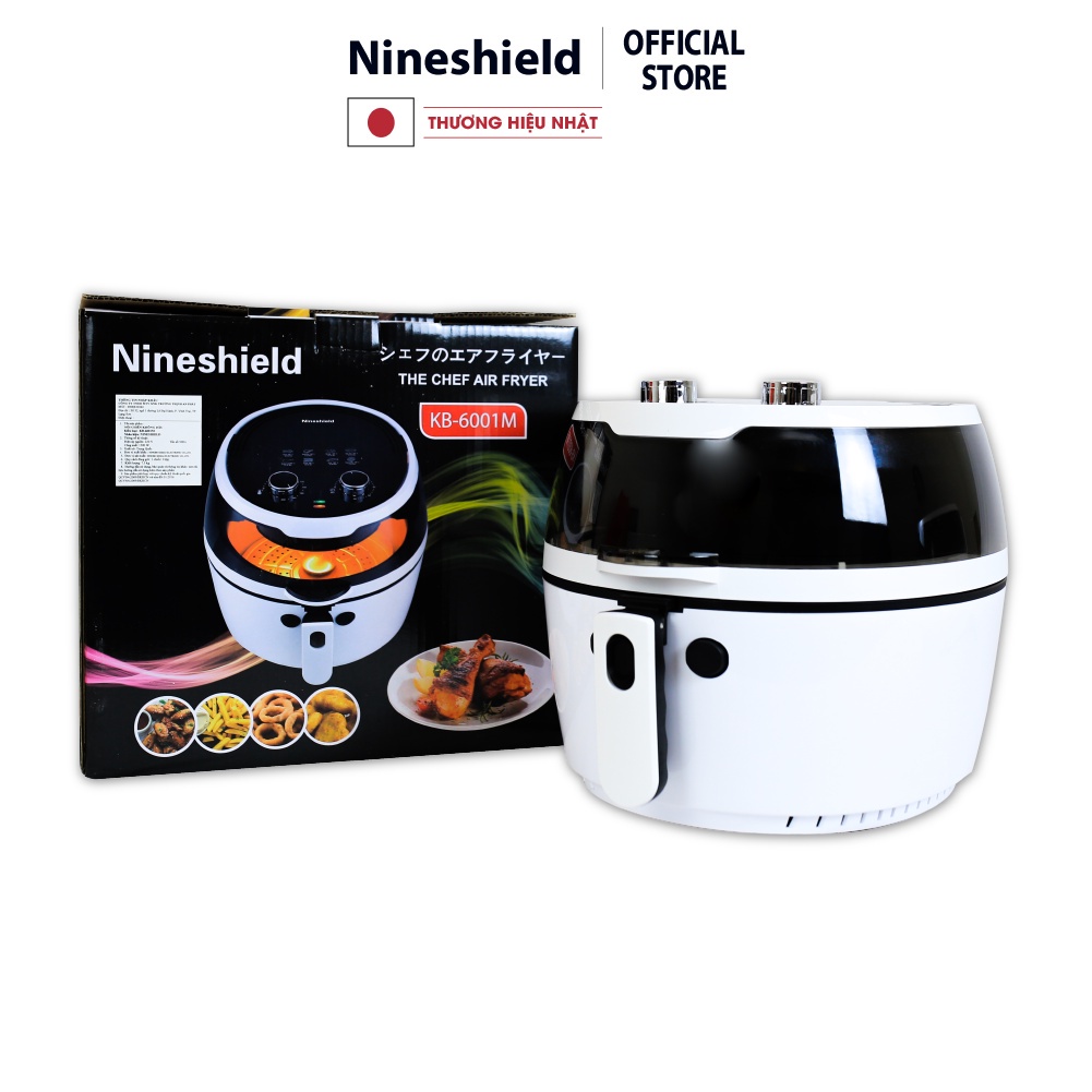 Nồi chiên không dầu 8L Nine Shield chính hãng KB-6001M. Dòng sản phẩm nồi chiên cơ cao cấp đến từ Nhật Bản lần đầu tiên có mặt tại Việt Nam. Sản phẩm nồi chiên dung tích lớn đến 8L, giúp bạn có thể quay, nướng cả 1 con gà, ngan, vịt 3 đến 4 kg. Ngoài ra giúp bạn chế biến các món quay nướng nhanh hơn, không mất thời gian nấu làm nhiều lần gây tốn điện, mất thời gian. Đặc biệt, dung tích lớn nhưng sản phẩm được thiết kế thông minh, tận dụng nhiệt năng tối đa với quạt gió 11 canh, với công suất chỉ 1500W giúp bạn nấu ăn nhanh mà vẫn tiết kiệm điện.