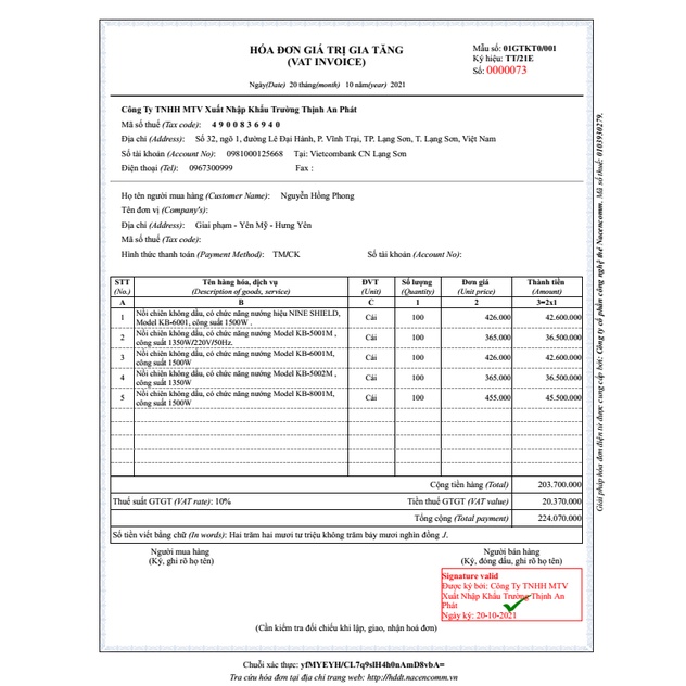 - Công Ty nhập khẩu: Công ty TNHH thương mại Hưng Thịnh Việt Nam