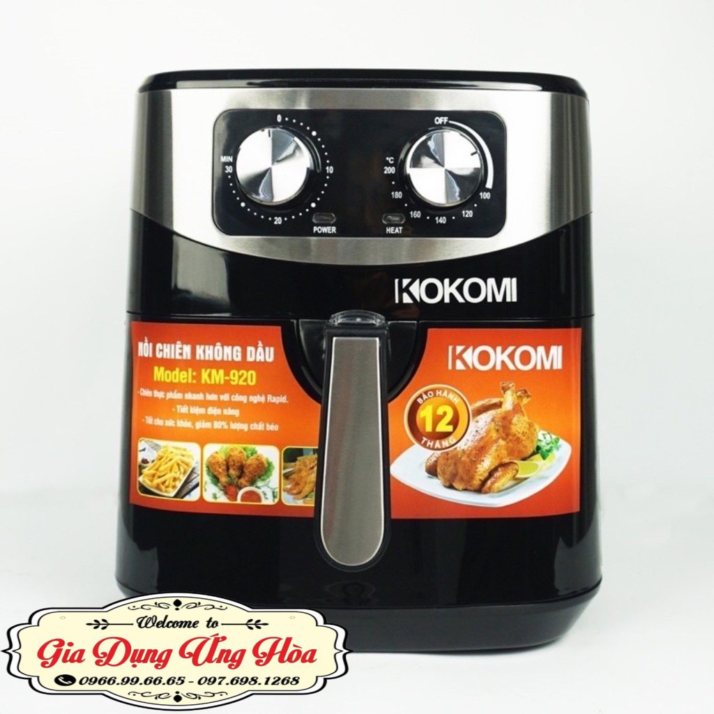 - Nồi chiên không dầu KOKOMI KM-920 là loại nồi cơ với 2 núm vặn cho phép bạn điều chỉnh nhiệt độ và thời gian linh hoạt, dễ sử dụng và đặc biệt bền chắc.