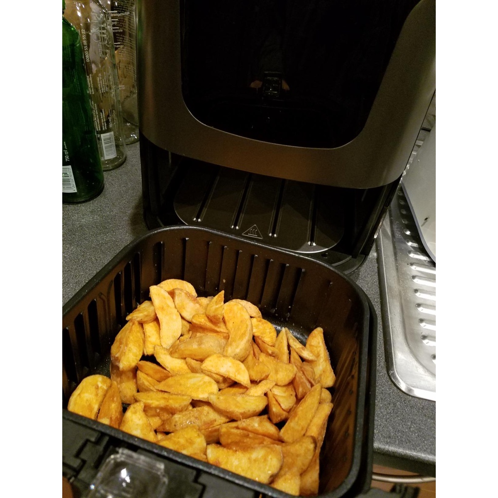 - Giỏ chiên tráng chống dính và có kích thước rộng rãi (3.5L) có thể được tháo ra dễ dàng và an toàn bất cứ lúc nào bằng cách sử dụng tay cầm cảm ứng mát. Giỏ an toàn với máy rửa chén và do đó dễ dàng làm sạch.