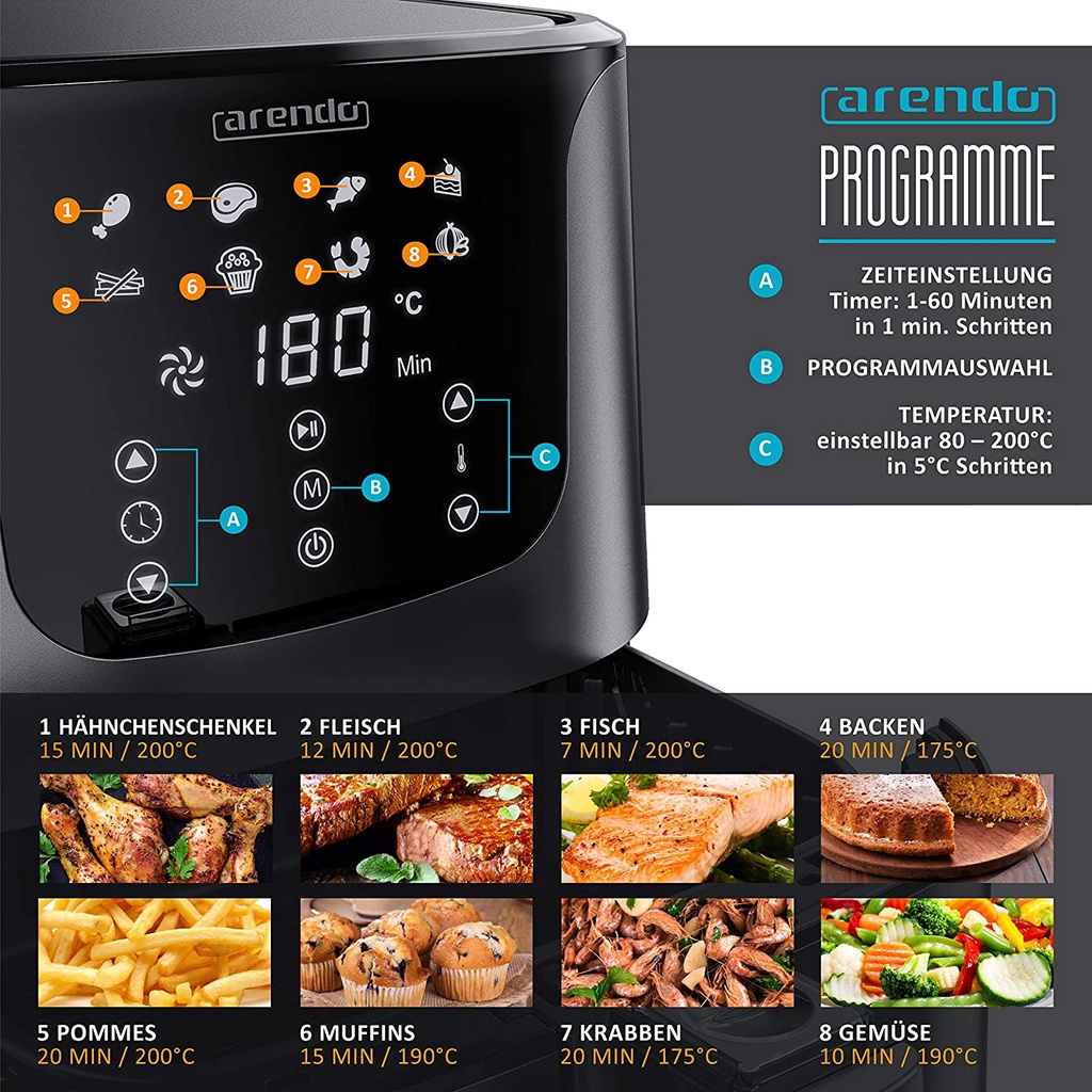 - 8 chương trình chức năng: thịt, cá, nướng, khoai tây chiên, bánh nướng xốp, cua và rau. Do hàm lượng chất béo tối thiểu, không có mùi nồng như mùi xảy ra khi chiên ngập dầu nóng. Và vì được thiết kế giảm tiếng ồn nên nồi chiên không dầu Arendo hoạt động yên tĩnh.