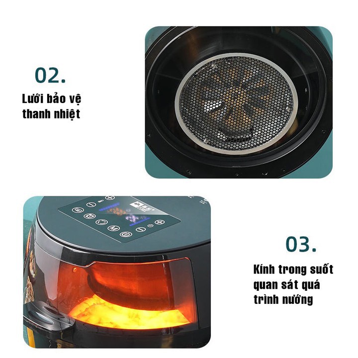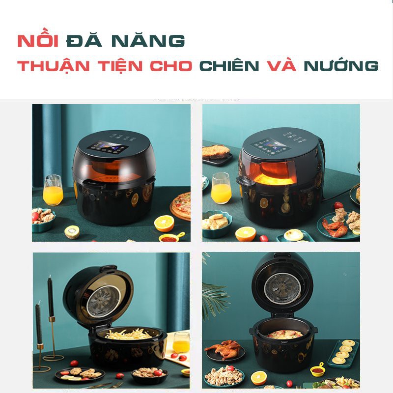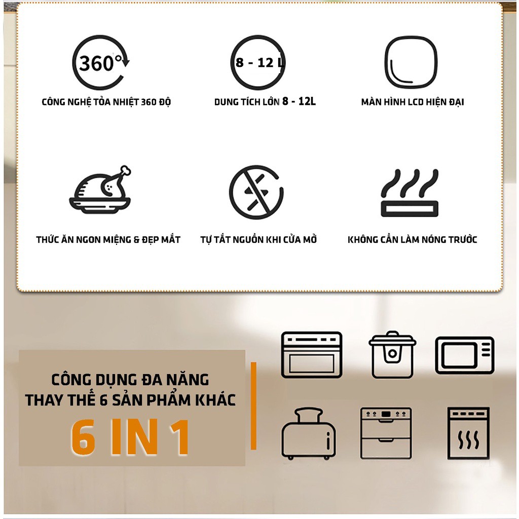 - Dung tích nồi chiên 8L phù hợp để bạn nấu thực phẩm hàng ngày cho gia đình khoảng 6-8 người. Tích hợp 6 chế độ nấu riêng biệt: nướng, chiên không dầu, quay vi sóng, nướng bánh mì, khử trùng, sấy khô giúp bạn đa dạng cách chế biến và nấu được nhiều món cho gia đình