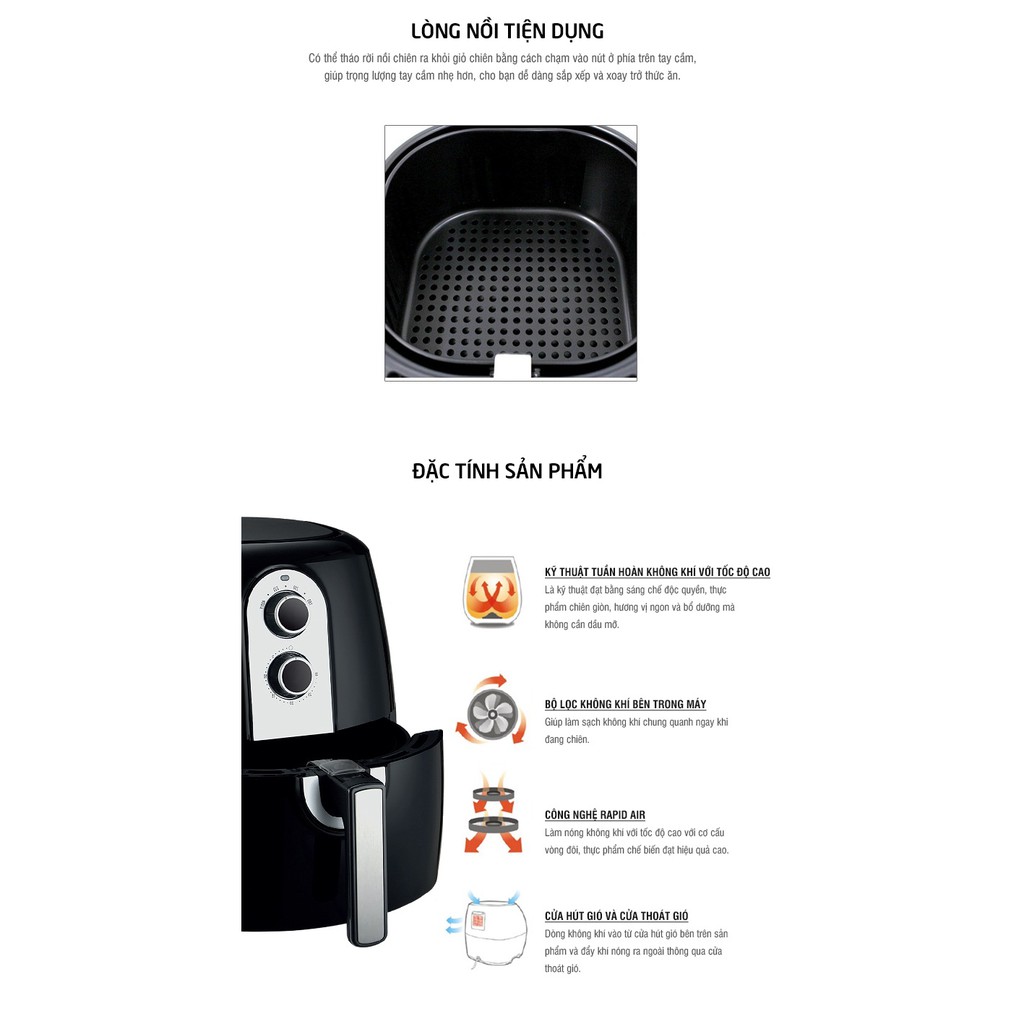 Nồi chiên có chức năng hẹn giờ tích hợp cho phép bạn đặt sẵn thời gian nấu lên đến 30 phút. Điều khiển nhiệt độ có thể điều chỉnh cho phép bạn đặt trước nhiệt độ nấu phù hợp với thức ăn lên đến 200 độ C. Lòng nồi phủ lớp chống dính có thể tháo rời và giỏ thức ăn có thể rửa được bằng máy rửa chén, giúp việc vệ sinh máy trở nên dễ dàng.