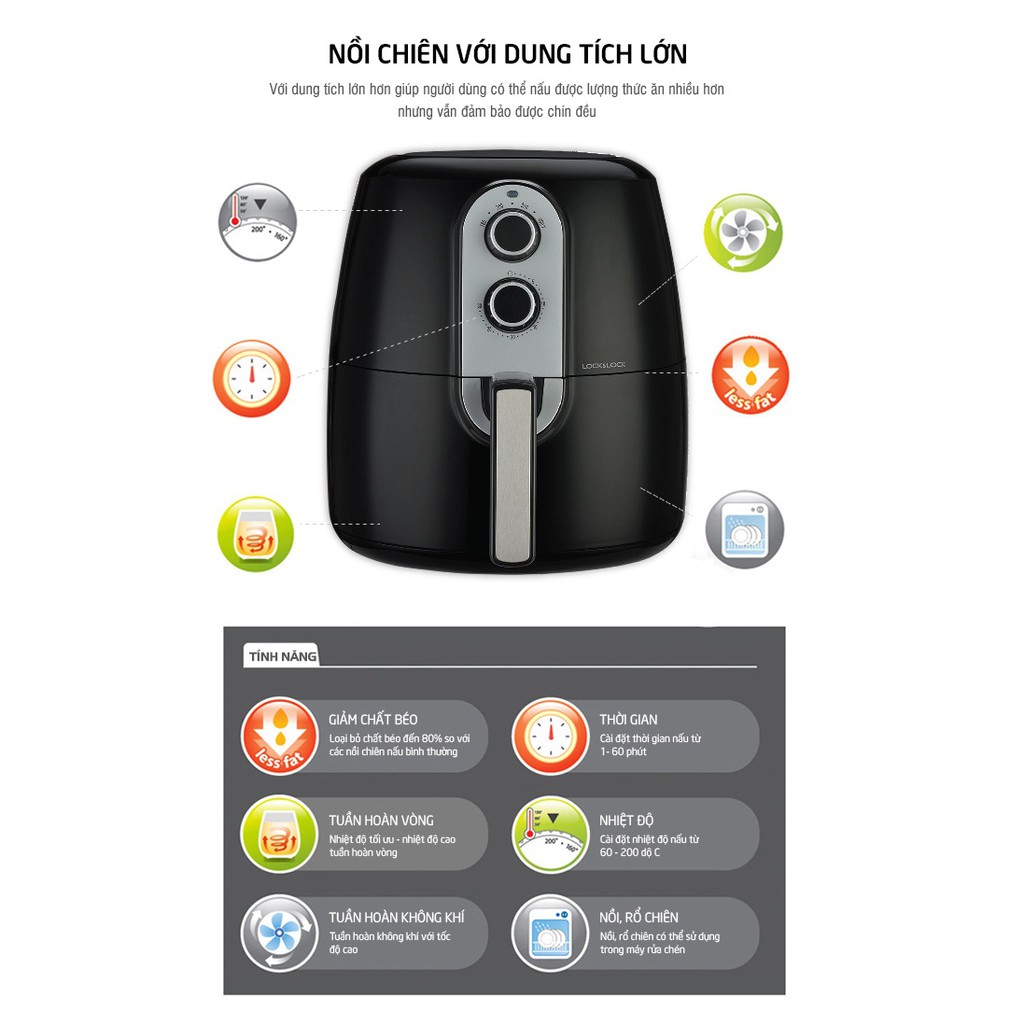 Nồi chiên không dầu Lock&Lock với công nghệ mới cho phép bạn rán, nướng bánh, nướng và quay thực phẩm nhanh chóng, ít chất béo hơn so với nồi chiên thông thường nhờ việc sử dụng ít dầu hoặc không có dầu, cũng tạo ra ít mùi hơn và an toàn cho sức khỏe. Cũng nhờ công nghệ chiên chân không, thức ăn được làm nóng 360 độ bằng cách đốt nóng không khí bên trong nồi, kết hợp quạt thổi giúp lan tỏa luồng khí nóng luân chuyển nhanh và mạnh đều khắp bề mặt thực phẩm. Nhờ đó, mà thực phẩm khi bạn chiên bằng nồi chiên không dầu sẽ được chín vàng đều, thơm ngon hơn so với chiên rán thông thường.