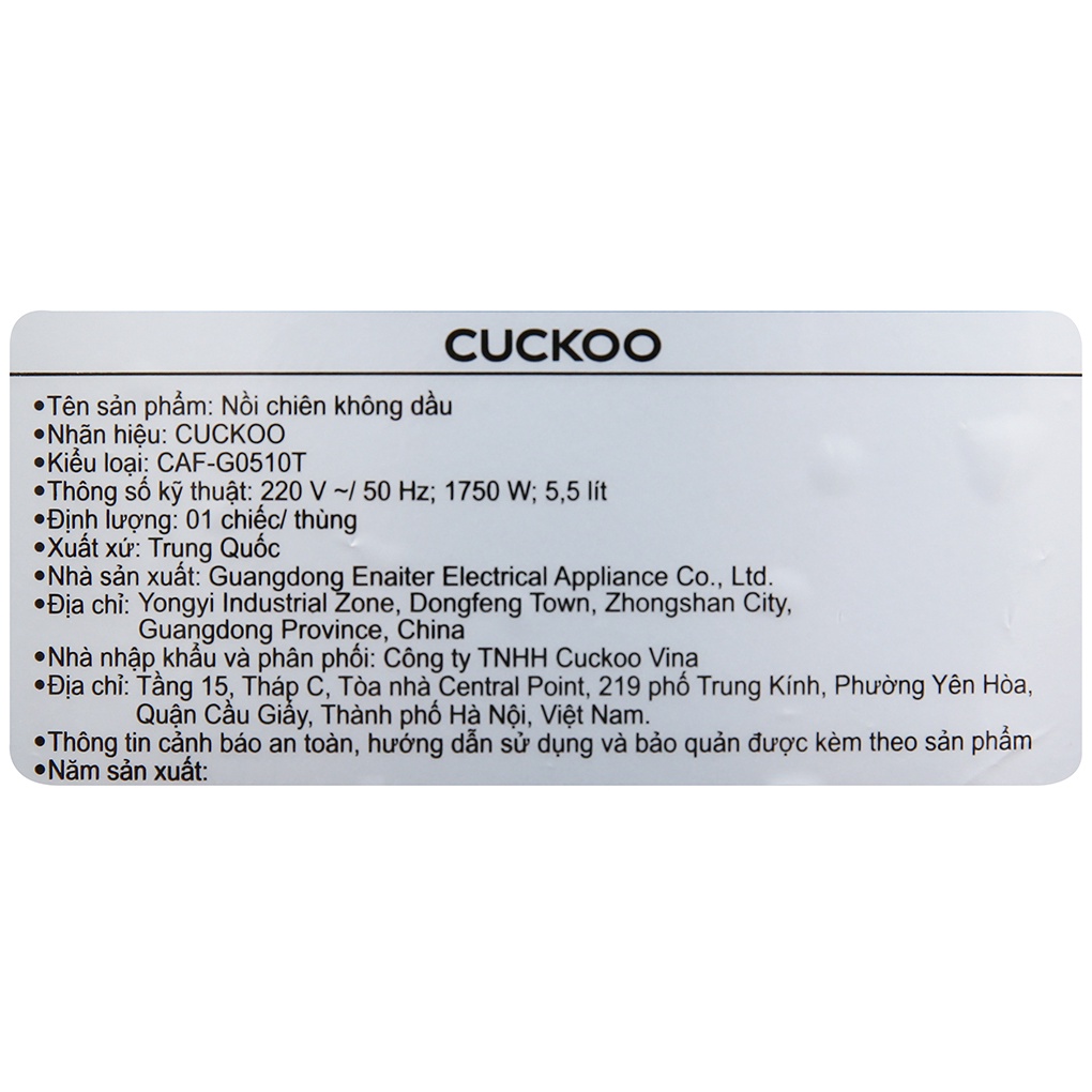 [Mã ELHADEV giảm 4% đơn 300K] Nồi chiên không dầu Cuckoo CAF-G0510T 5.5 lít Công suất 1750W BH 12 tháng, Chính hãng