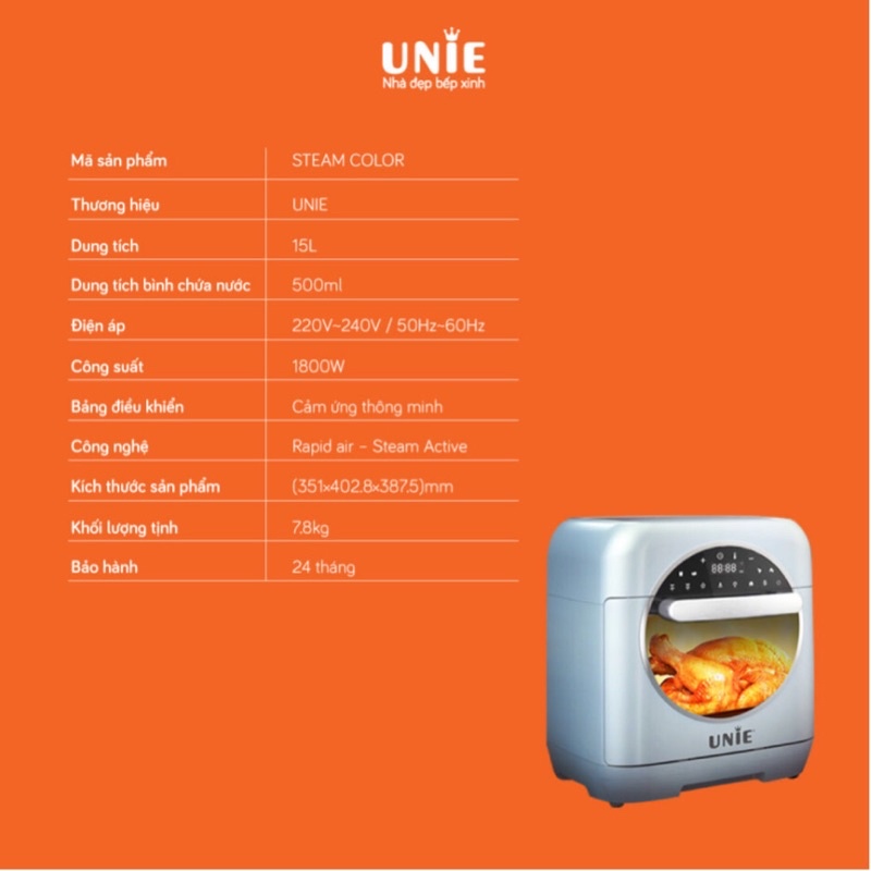 NỒI CHIÊN KHÔNG DẦU ĐA NĂNG UNIE STEAM COLOR 15L CHIÊN HẤP THÔNG MINH 2 TRONG 1 CHÍNH HÃNG BẢO HÀNH 24 THÁNG