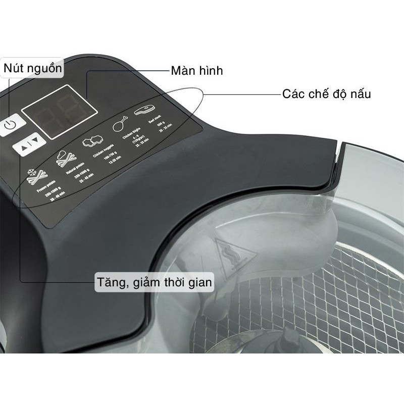 Chiếc nồi chiên không dầu này có trang bị bộ đếm kĩ thuật số hiển thị thời gian trên màn hình LCD để bạn nắm bắt được thời gian nấu hợp lý. Nồi cũng có thể tự động tắt rất an toàn, do đó bạn không cần quan tâm đến việc nồi chiên bị quá lửa hay cháy khét. Sau khi hoàn tất quá trình nấu nồi sẽ có âm báo để bạn chủ động lấy món ăn ra.Grandon Home đã tạo nên một bước đột phá với thêm 1 giá chiên để bạn nấu toàn bộ bữa ăn với chỉ 1 lần nấu. Vì vậy, nồi có thể chứa tới 1,5kg thực phẩm, có thể phục vụ tới 5 - 6 phần ăn.