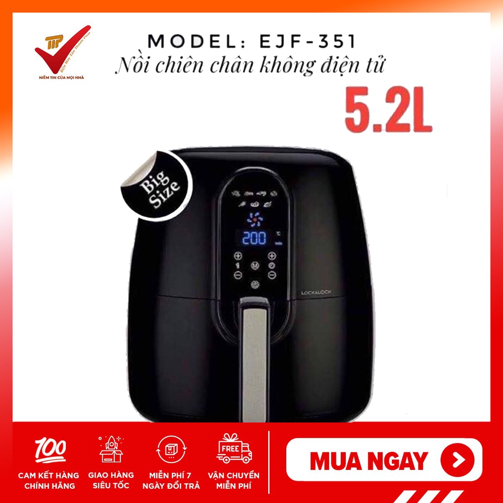 Nồi chiên không dầu điện tử 5.2L EJF351 Lock&LockNồi chiên không dầu Lock&Lock EJF351BLK 5.2L công suất 1800W với dung tích siêu lớn 5.2L tiện lợi để chiên được nhiều loại thực phẩm khác nhau như: cá, thịt, khoai tây.. Điều khiển điện tử hiện đại, có vỏ ngoài được làm từ chất liệu nhựa bền đẹp, chịu nhiệt tốt và dễ dàng lau chùi khi bị bám bẩn.