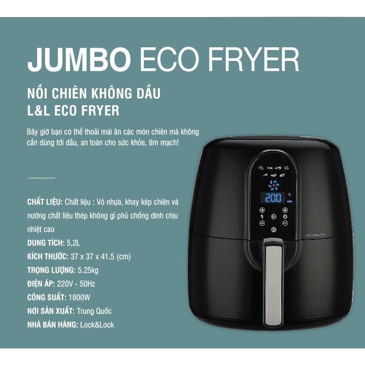 Thiết Bị Điện Gia Dụng > Đồ gia dụng nhà bếp > Nồi chiên ngập dầu || NỒI CHIÊN KHÔNG DẦU ĐIỆN TỬ 5.2L [LOCK & LOCK CHÍNH HÃNG] EJF351Còn hàng