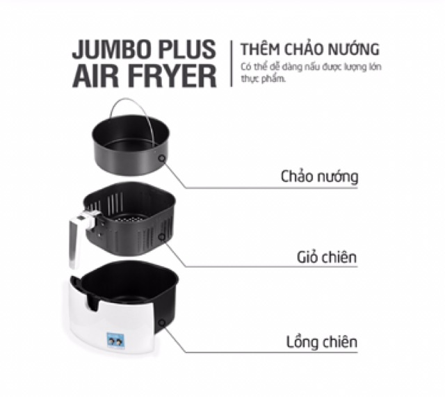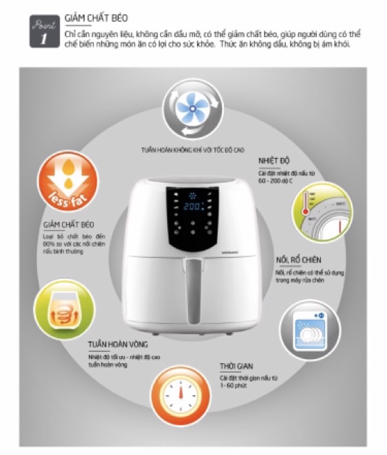 -Công nghệ mới cho phép bạn rán, nướng bánh, nướng và quay thực phẩm nhanh chóng, ít chất béo hơn so với nồi chiên thông thường nhờ việc sử dụng ít dầu hoặc không có dầu, cũng tạo ra ít mùi hơn và an toàn cho sức khỏe.