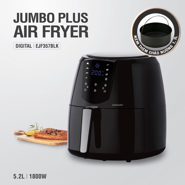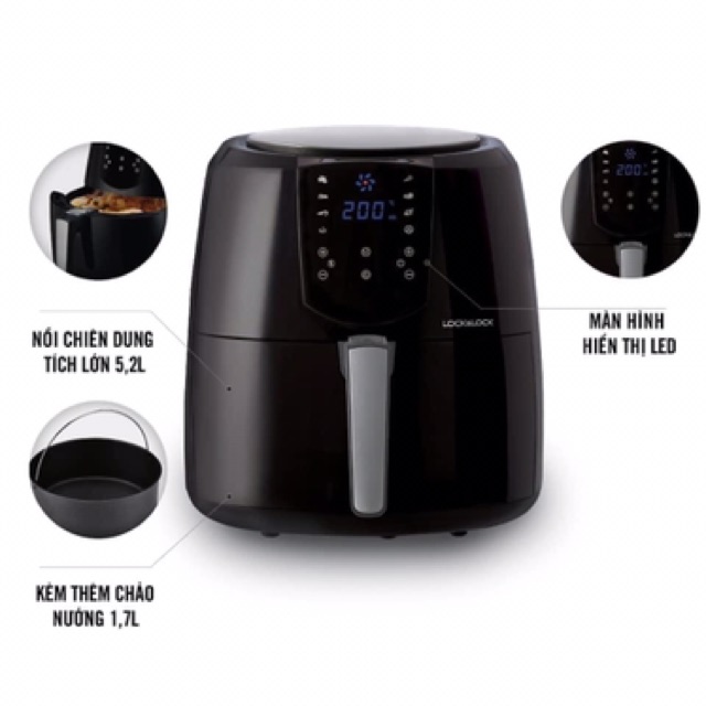 Nồi chiên không dầu Lock&Lock 5.2L 1800W với dung tích siêu lớn 5.2L tiện lợi để chiên được nhiều loại thực phẩm khác nhau như: cá, thịt, khoai tây.. Điều khiển điện tử hiện đại, có vỏ ngoài được làm từ chất liệu nhựa bền đẹp, chịu nhiệt tốt và dễ dàng lau chùi khi bị bám bẩn.