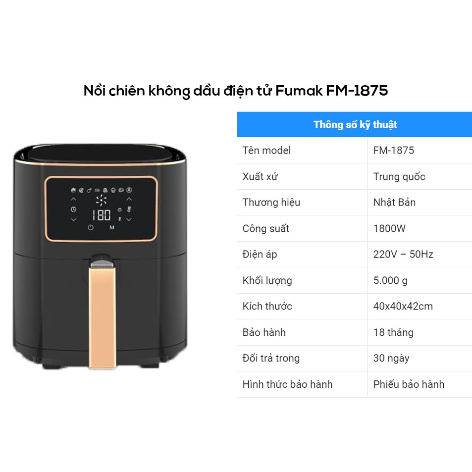Nồi Chiên Không Dầu Điện Tử Fumak FM1875 Nhật Bản, Dung Tích 7.5L Chín Nhanh, Tản Nhiệt Đều [ Bảo hành 18 tháng]