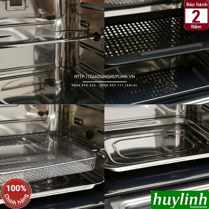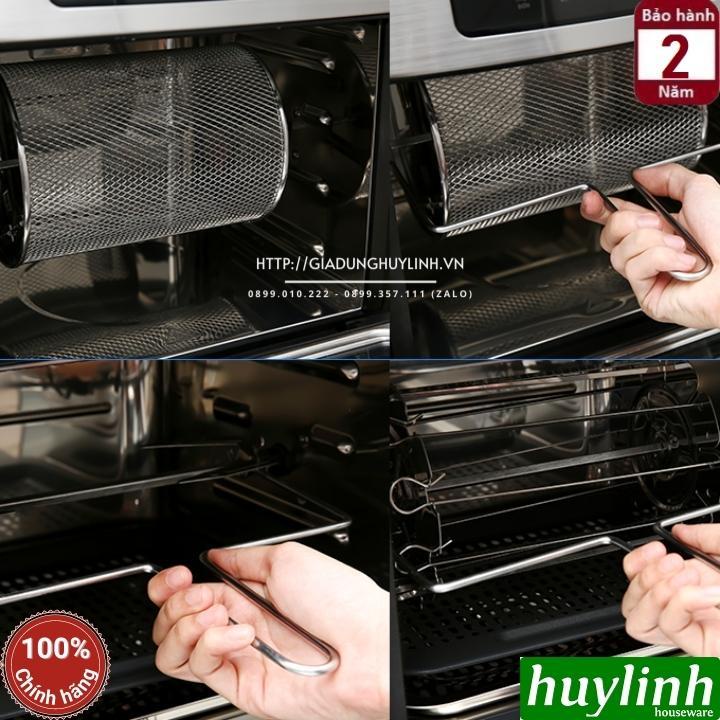 - Đa dạng phụ kiện đi kèm với: Nướng xiên quay, giỏ lồng quay, Nhông quay, dụng cụ lấy đồ, khay hứng dầu ăn, vỉ nướng chống dính
