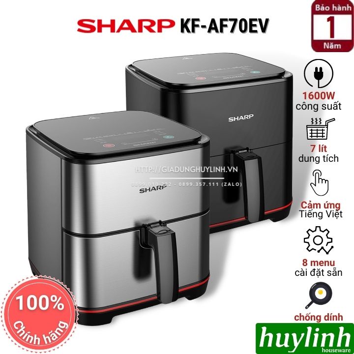 Nồi chiên không dầu điện tử Sharp AF70EV hoạt động với dung tích 7 lít, công suất 1600W phục vụ hoạt động cho 4 - 6 người với bảng điều khiển cảm ứng, cùng 8 chức năng cài đặt sẵn dễ dàng sử dụng.Huy Linh phân phối và bảo hành chính hãng tại Sharp Việt Nam
