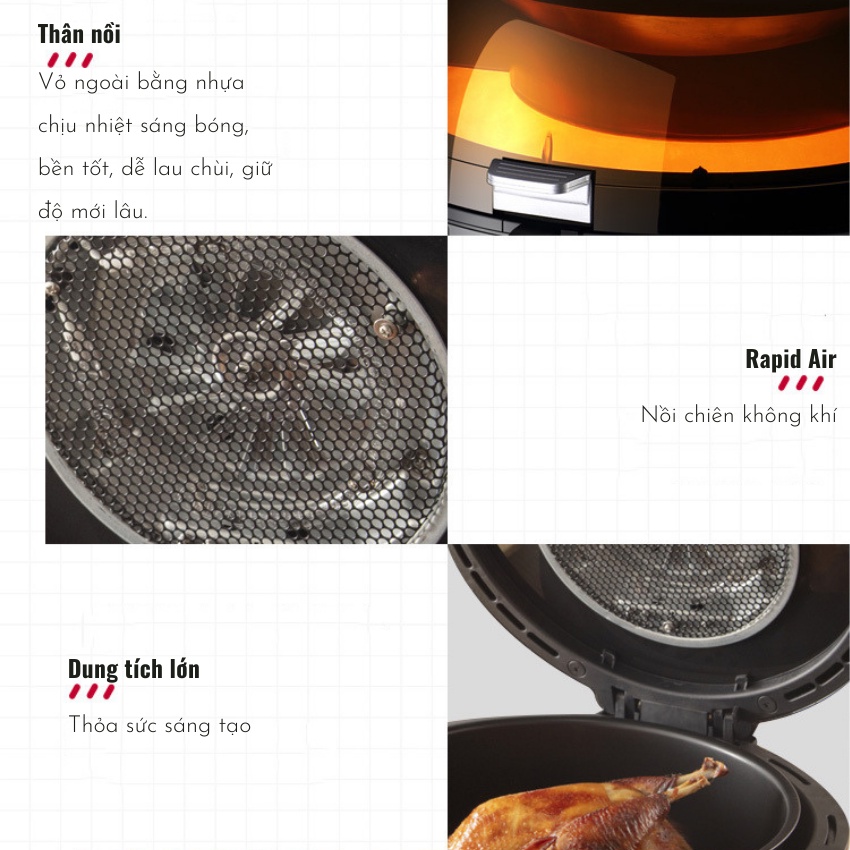 • Nồi chiên không dầu hoạt động trên không khí nóng nên không cần dầu, mỡ chiên