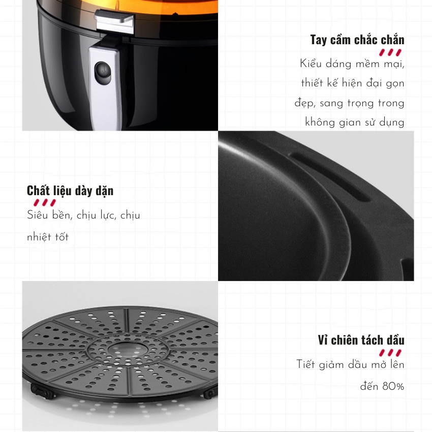 • Đảm bảo an toàn cho sức khỏe, giúp giảm thiểu tới 80% lượng dầu sử dụng, bảo vệ sức khỏe và tiết kiệm, không còn dầu văng tung tóe khi chiên bằng chảo, giữ nguyên vẹn mùi vị thơm ngon của thức ăn.
