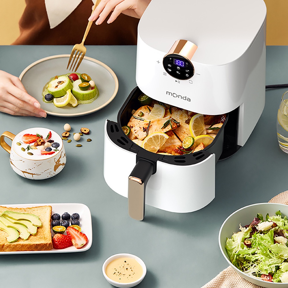 🔸 Nồi Chiên Không Dầu Monda sử dụng công nghệ chiên/nướng đối lưu Rapid Air - giảm 80% lượng dầu mở dư thừa.