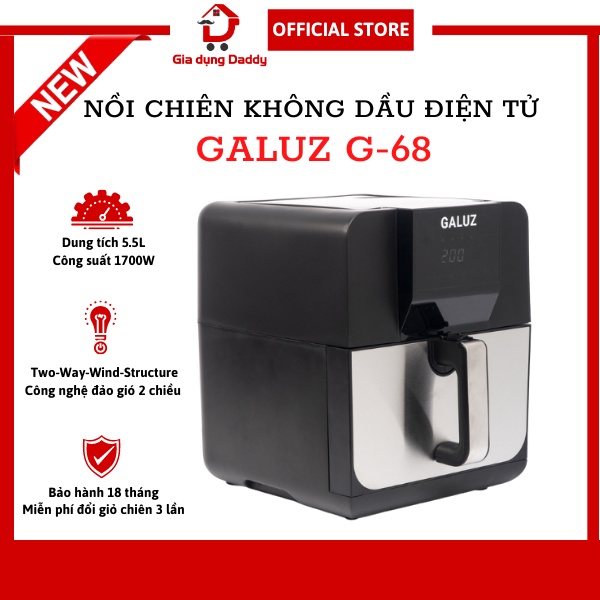 - Nồi chiên không dầu điện tử Galuz G-68 là mẫu mới nhất, được cải tiến cả về mẫu mã và chất lượng. Với công nghệ nổi bật: đảo gió 2 chiều (Two- way- wind structure) giúp không cần lật thức ăn mà vẫn chín đều. Đây là công nghệ lần đầu tiên xuất hiện trên thị trường nồi chiên không dầu.
