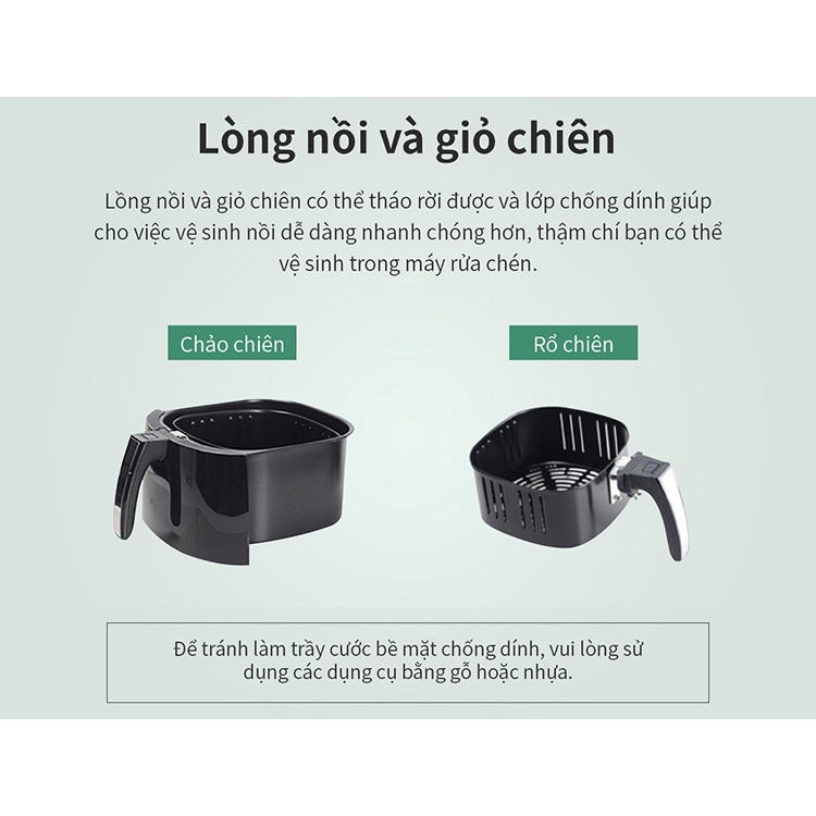 Chức năng cài đặt nhiệt độ từ 60 – 200 độ C, phù hợp với nhiệt độ chiên của nhiều món ăn. Ngoài ra, bạn cũng có thể định thời gian khi nấu, từ 1 phút đến 60 phút. Khi thời gian về 0, nồi chiên tự động dừng hoạt động. Sản phẩm được cài đặt sẵn nhiệt độ và thời gian nấu của 6 loại nguyên liệu là cá, tôm, xương sườn/thịt, thịt gà, đùi gà/vịt, khoai tây chiên với các biểu tượng hiện trên màn hình LCD.