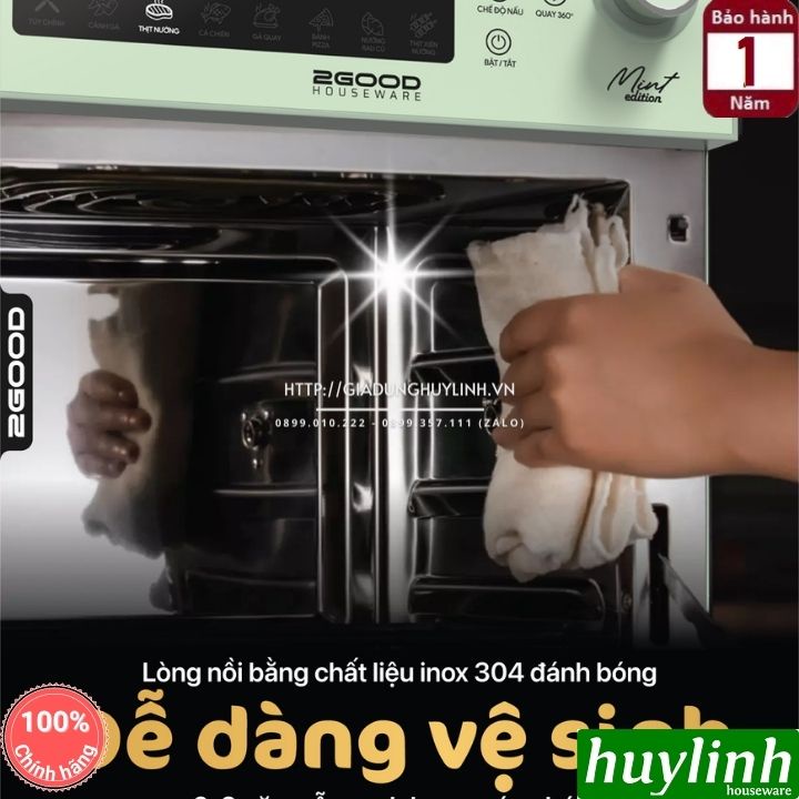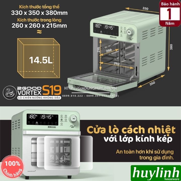 Nồi chiên không dầu 2Good Vortex S19 với thiết kế sang trọng cao cấp cùng 2 màu Xanh Mint - Đen, dung tích 14.5 lít, công suất 1600W đa dạng phụ kiện theo kèm dễ dàng sử dụng với 8 chức năng đi kèm.Huy Linh phân phối và bảo hành chính hãng tại 2Good Việt Nam
