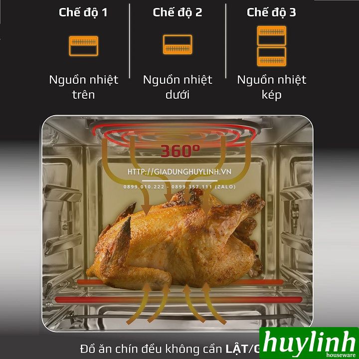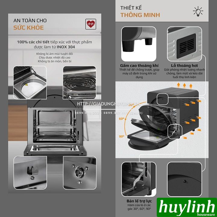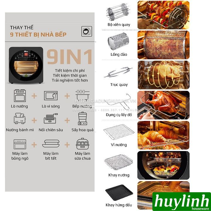 - Dung tích lớn 15 lít, giúp có thể chiên nướng cả 1 con gà, hoặc 2 -3 món ăn cùng 1 lúc nhờ thiết kế 2 tầng để thực phẩm