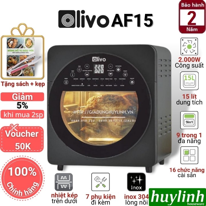 [Mã ELHAMS5 giảm 6% đơn 300K] Nồi chiên không dầu điện tử Olivo AF15 - 15 lít - Tặng Voucher